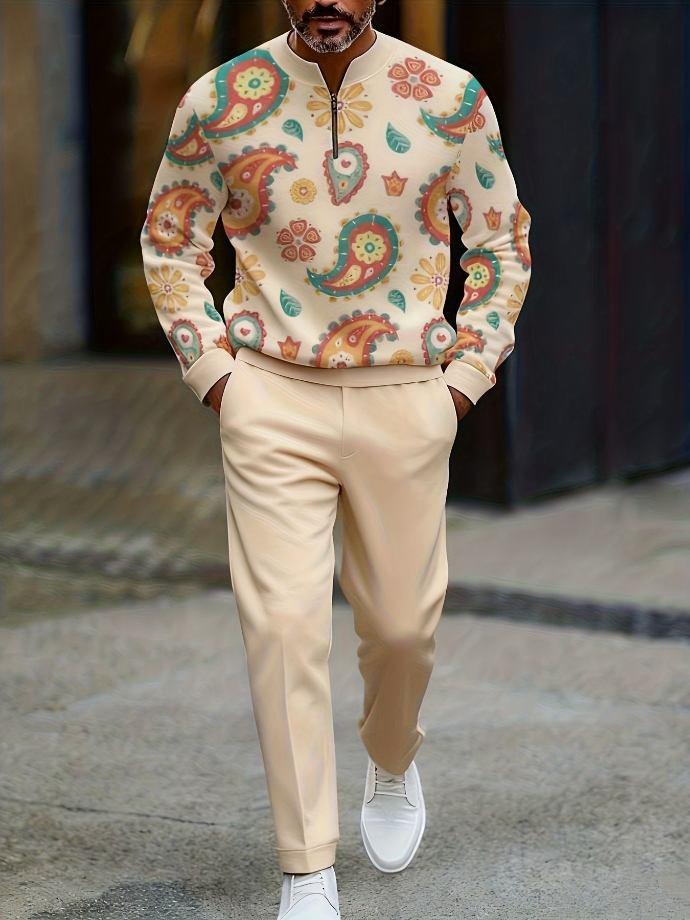 Men's Casual Orange Flower Printed Round-Neck Zipper Long Sleeved Trousers Two-Piece Set