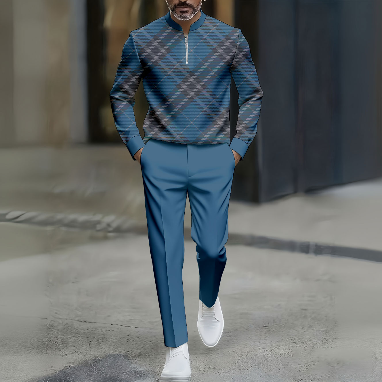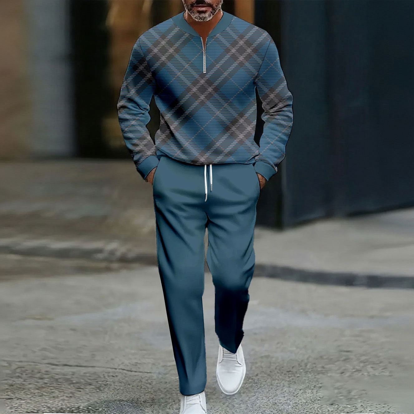 Men's Casual Bule Color Matching Checked Printed Round-Neck Zipper Long Sleeved Trousers Two-Piece Set