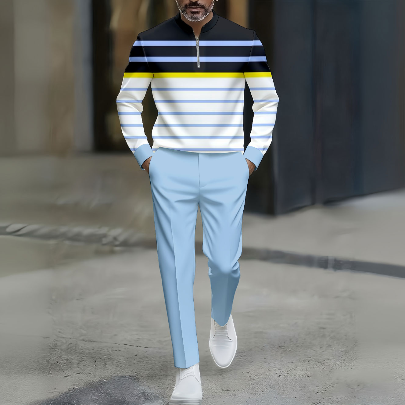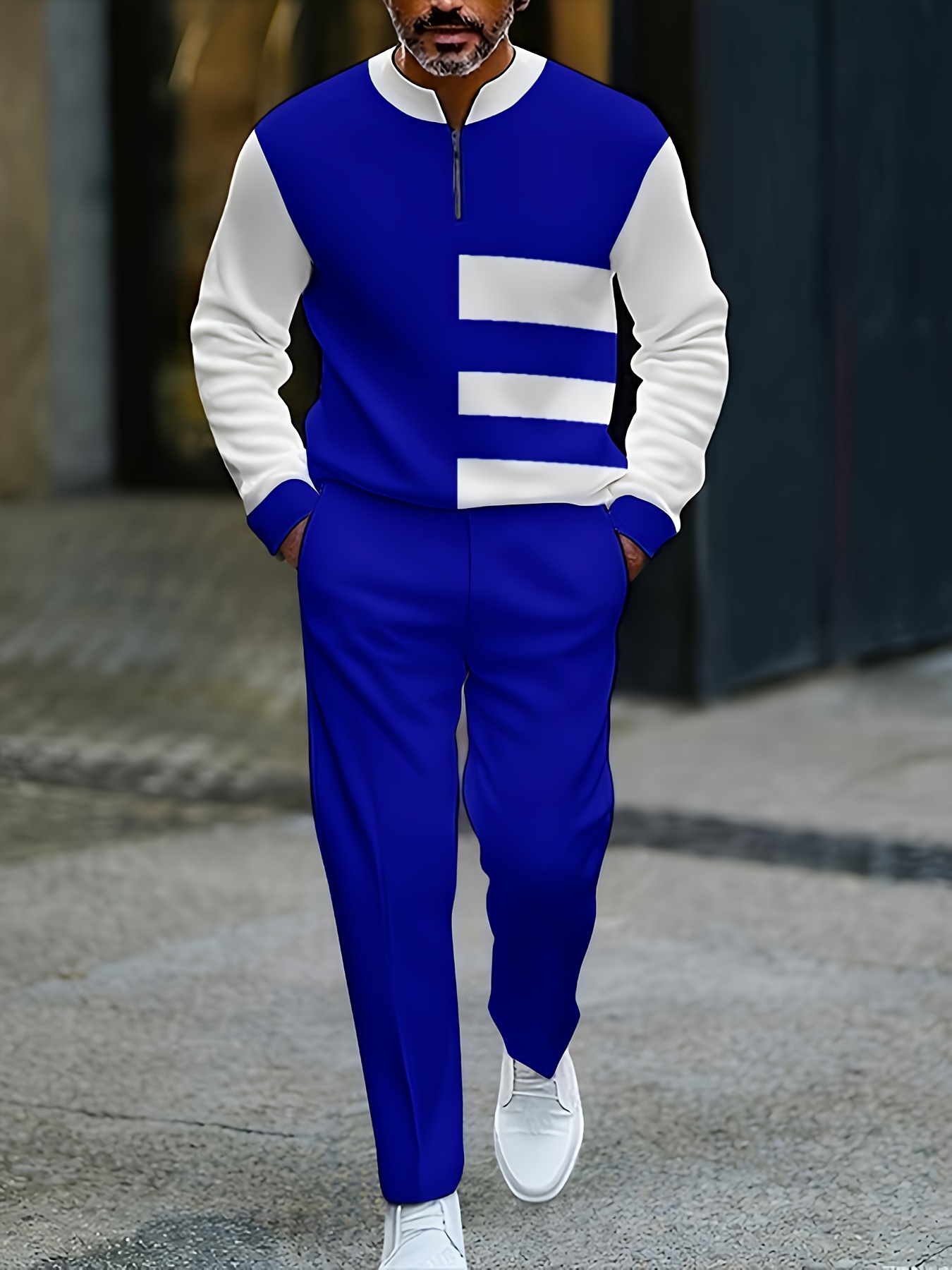 Men's Casual Blue Color Matching Striped Printed Round-Neck Zipper Long Sleeved Trousers Two-Piece Set