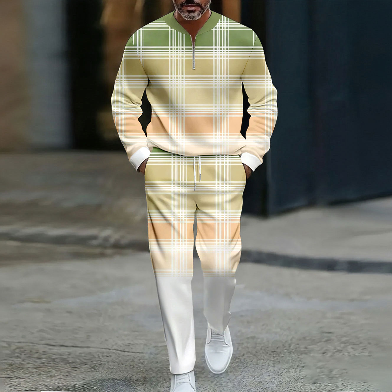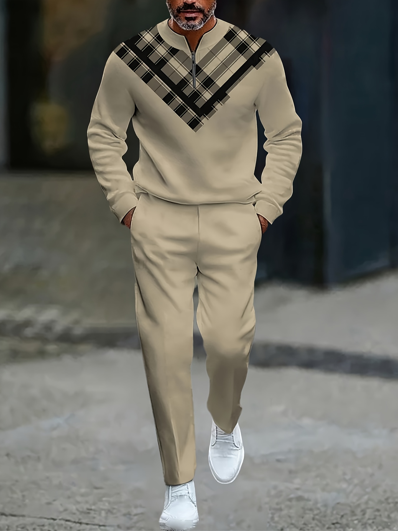 Men's Casual Color Matching Checked Printed Round-Neck Zipper Long Sleeved Trousers Apricot Two-Piece Set