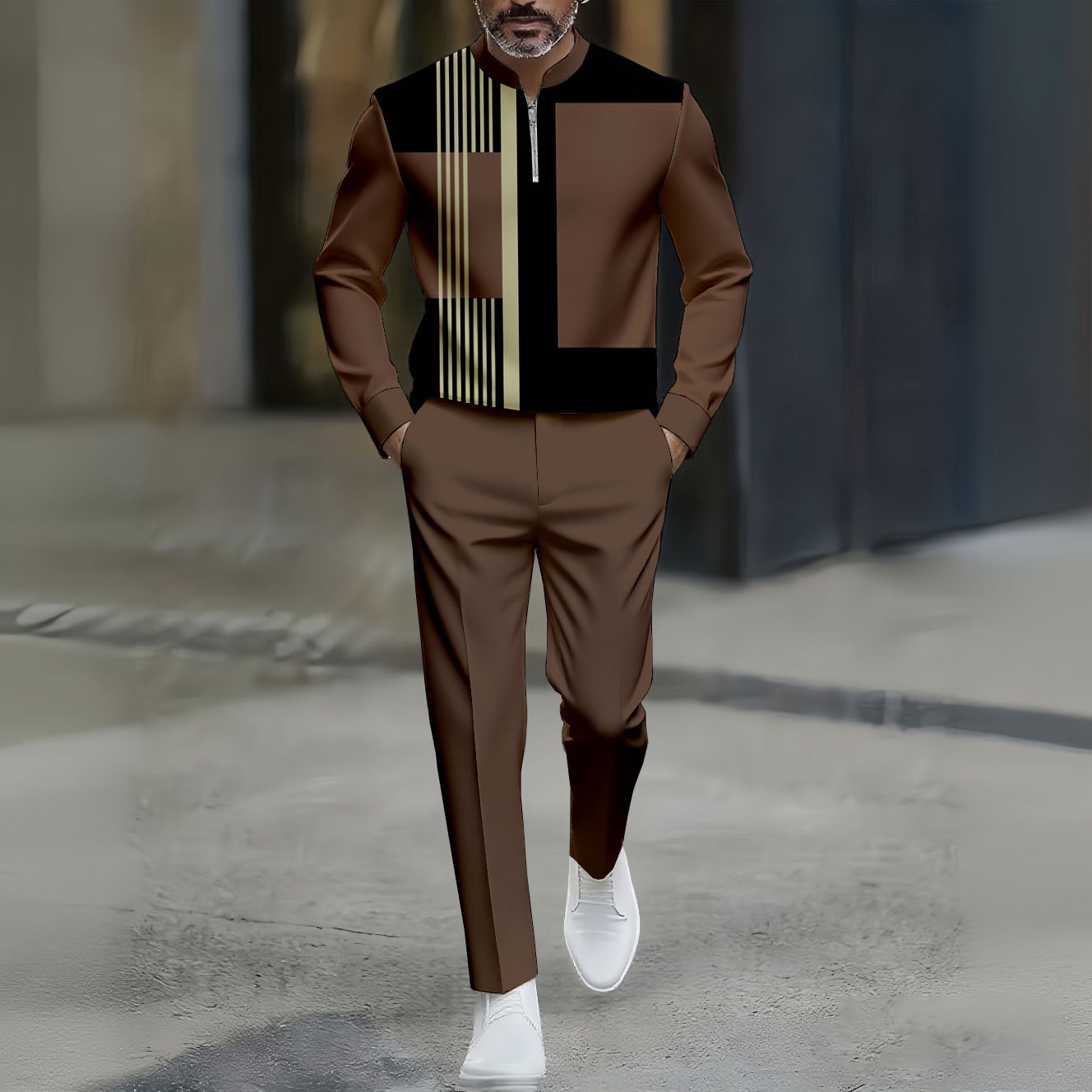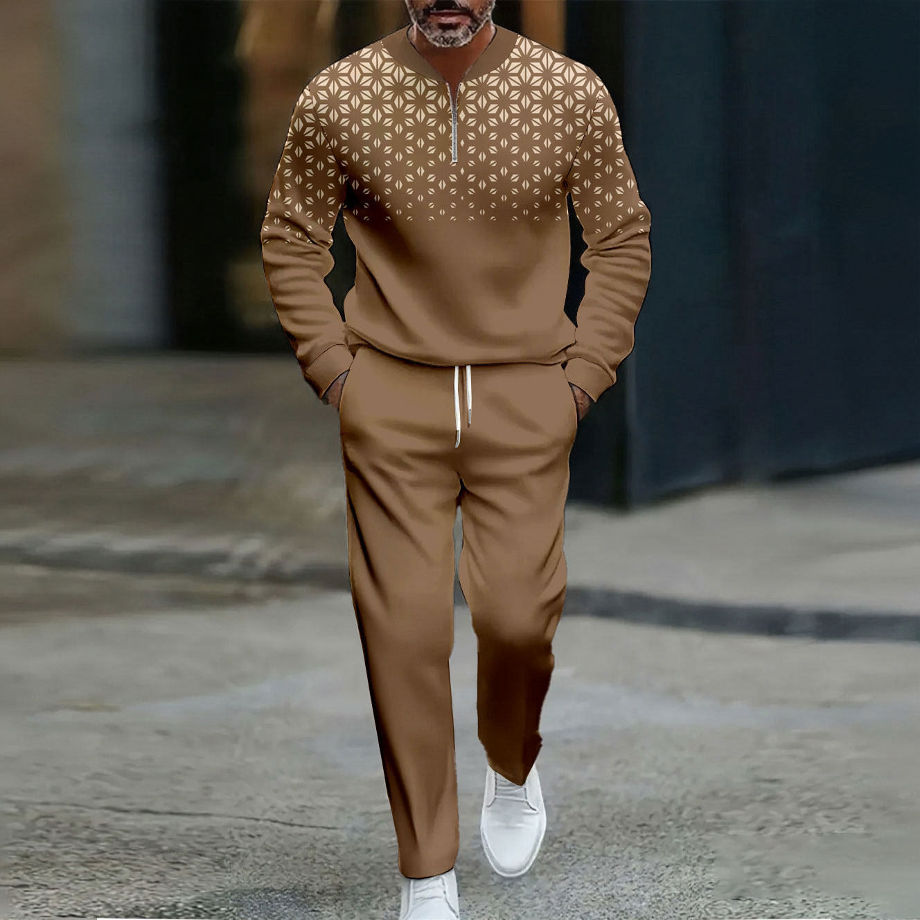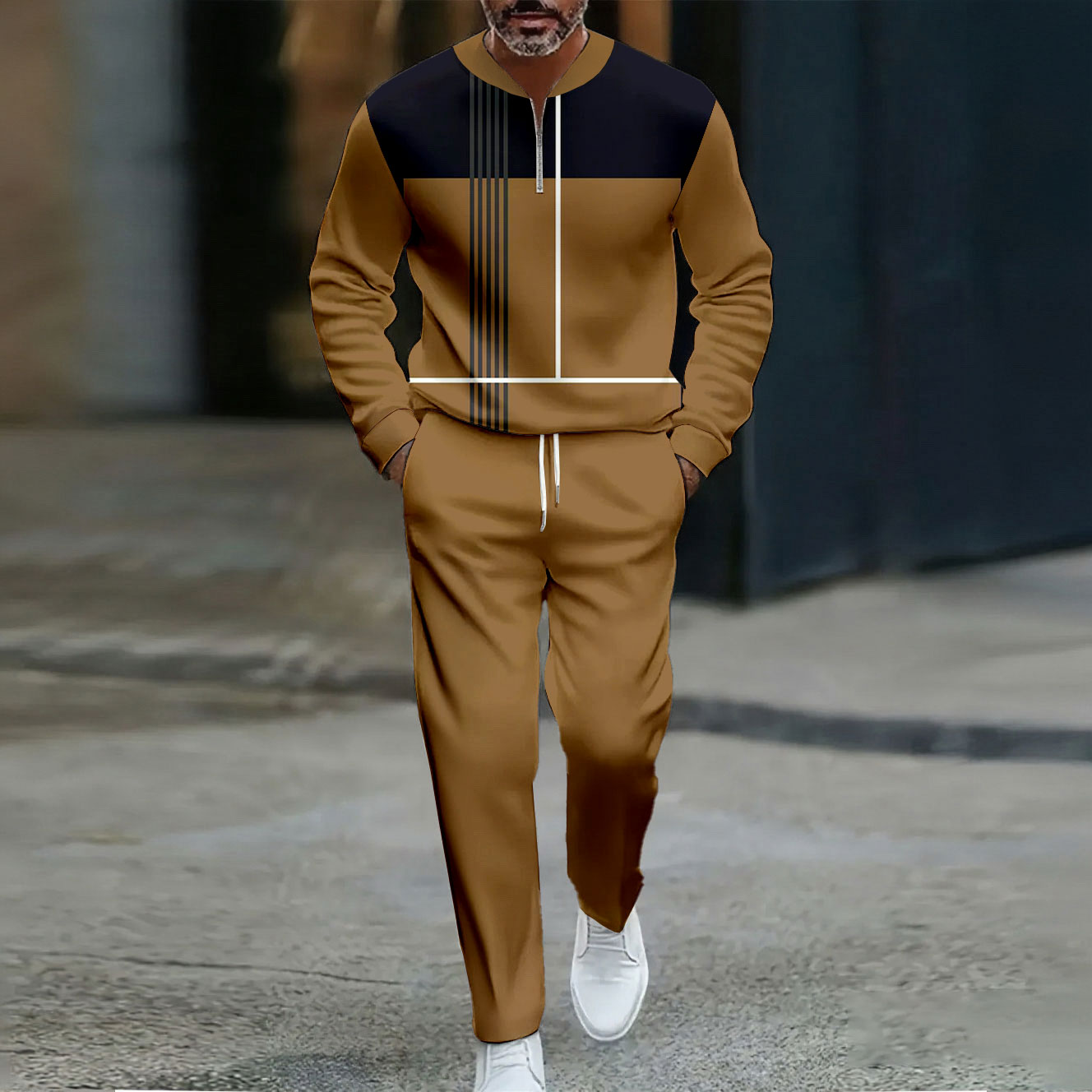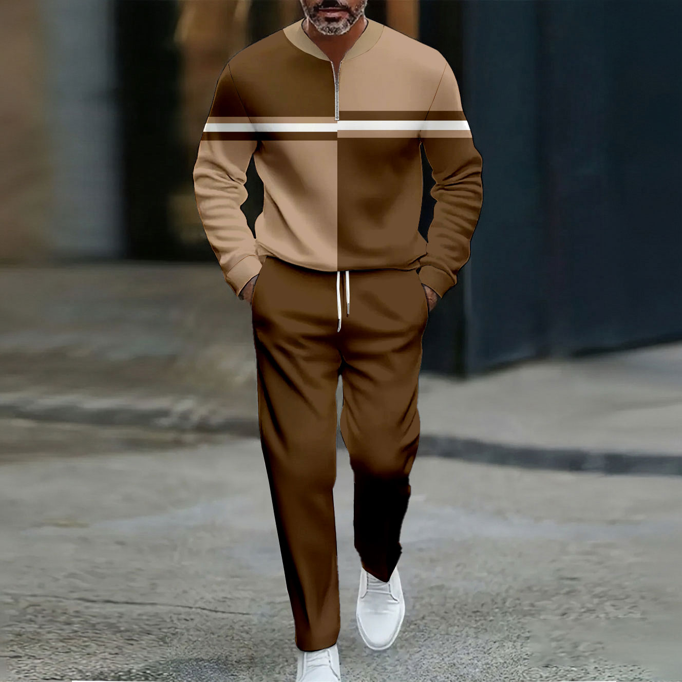 Men's Casual Color Matching Printed Round-Neck Zipper Long Sleeved Trousers Coffee Two-Piece Set