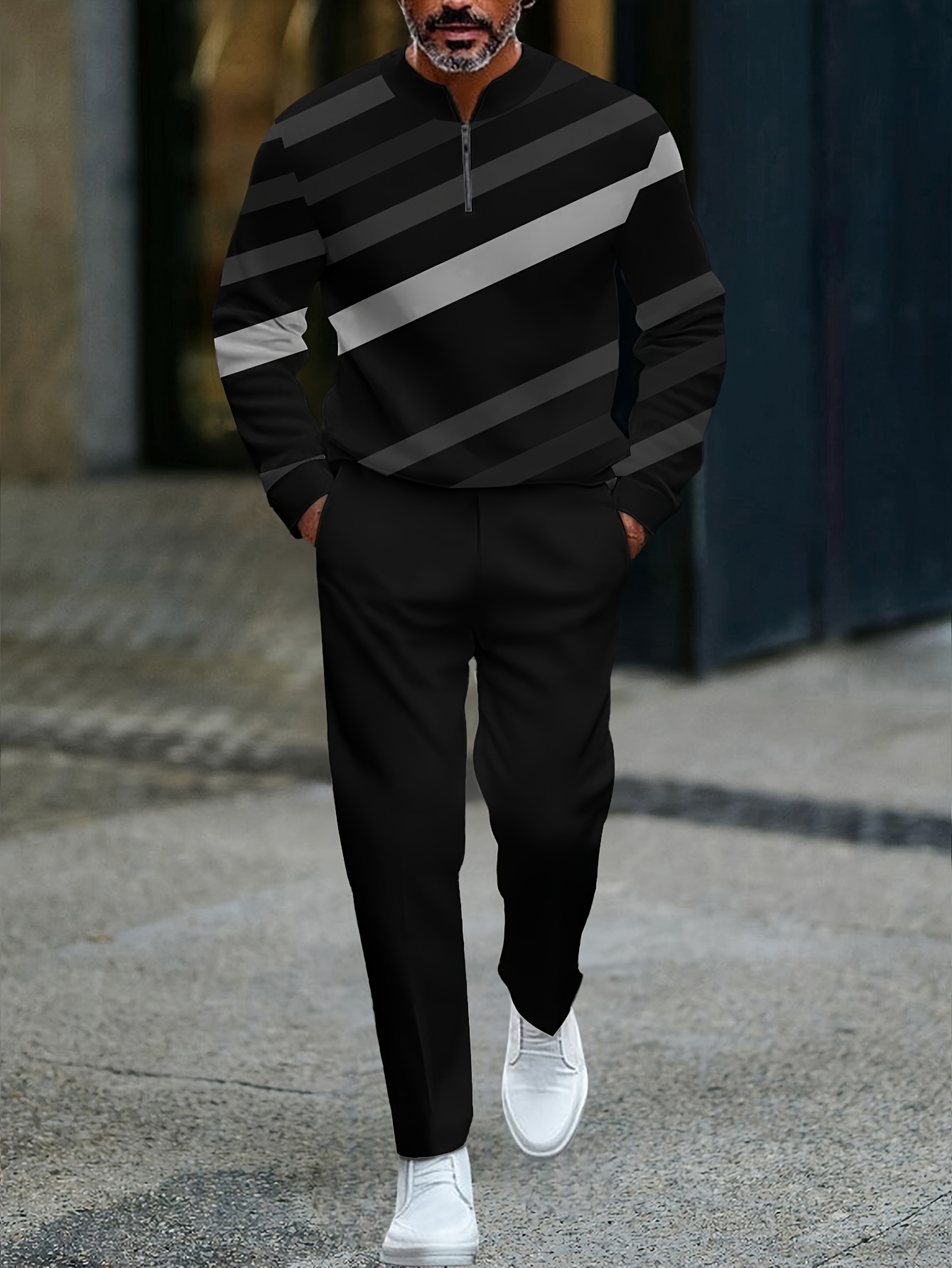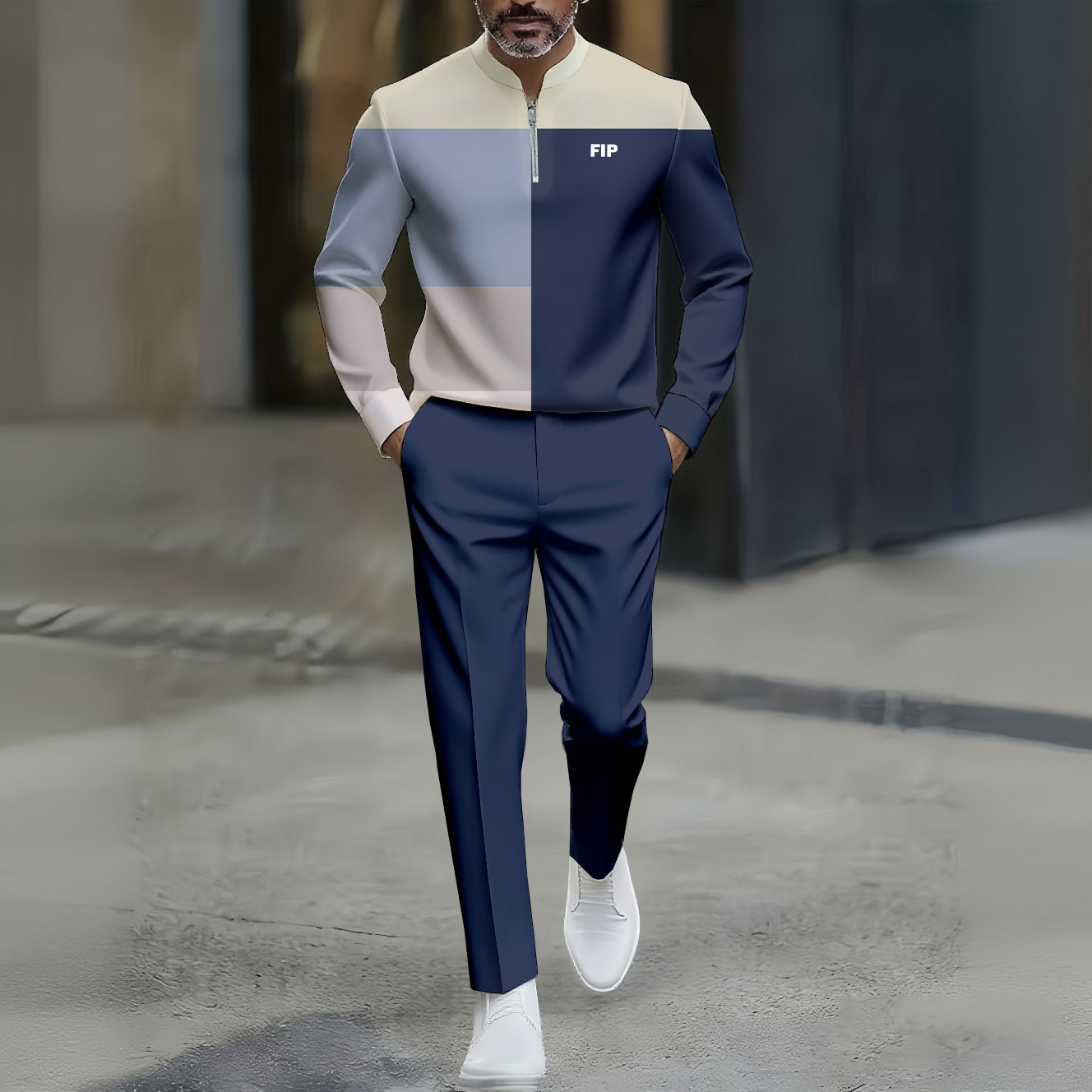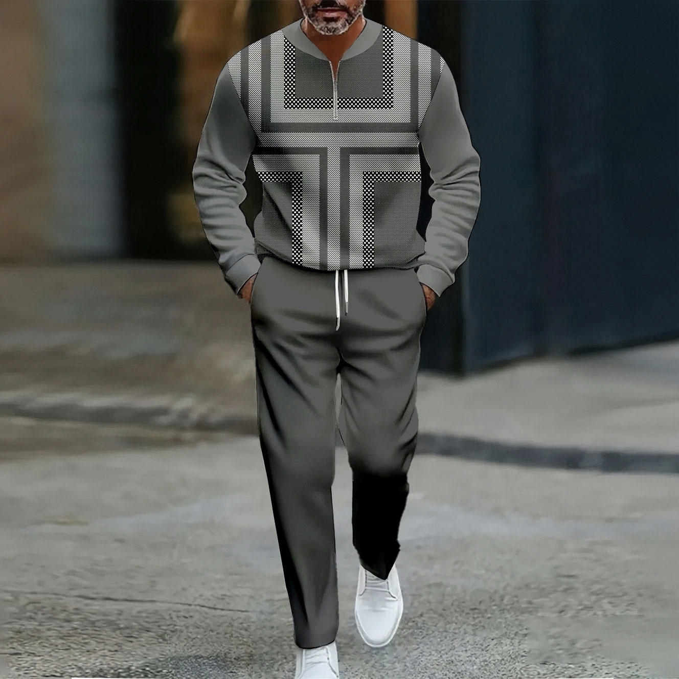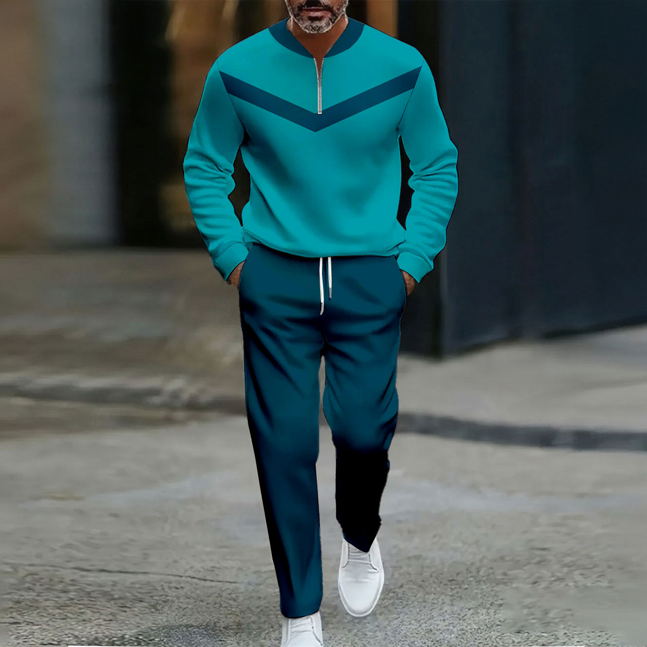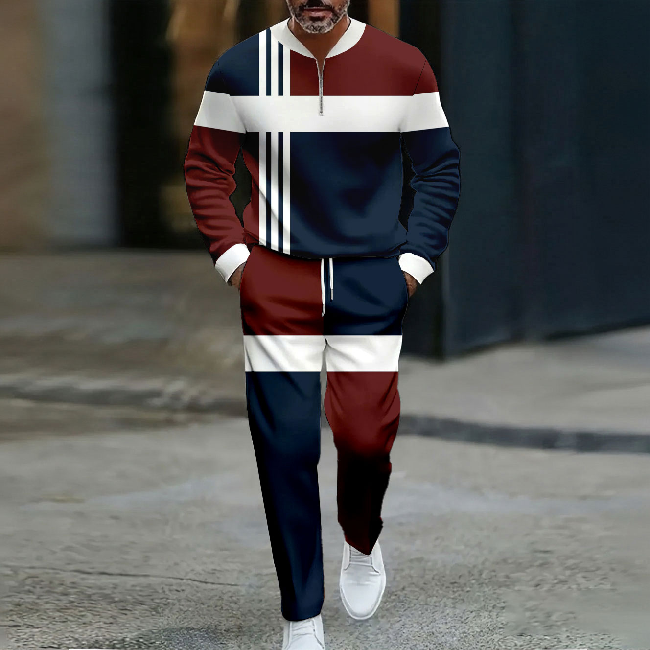 Men's Casual Color Matching Printed Round-Neck Zipper Long Sleeved Trousers Two-Piece Set