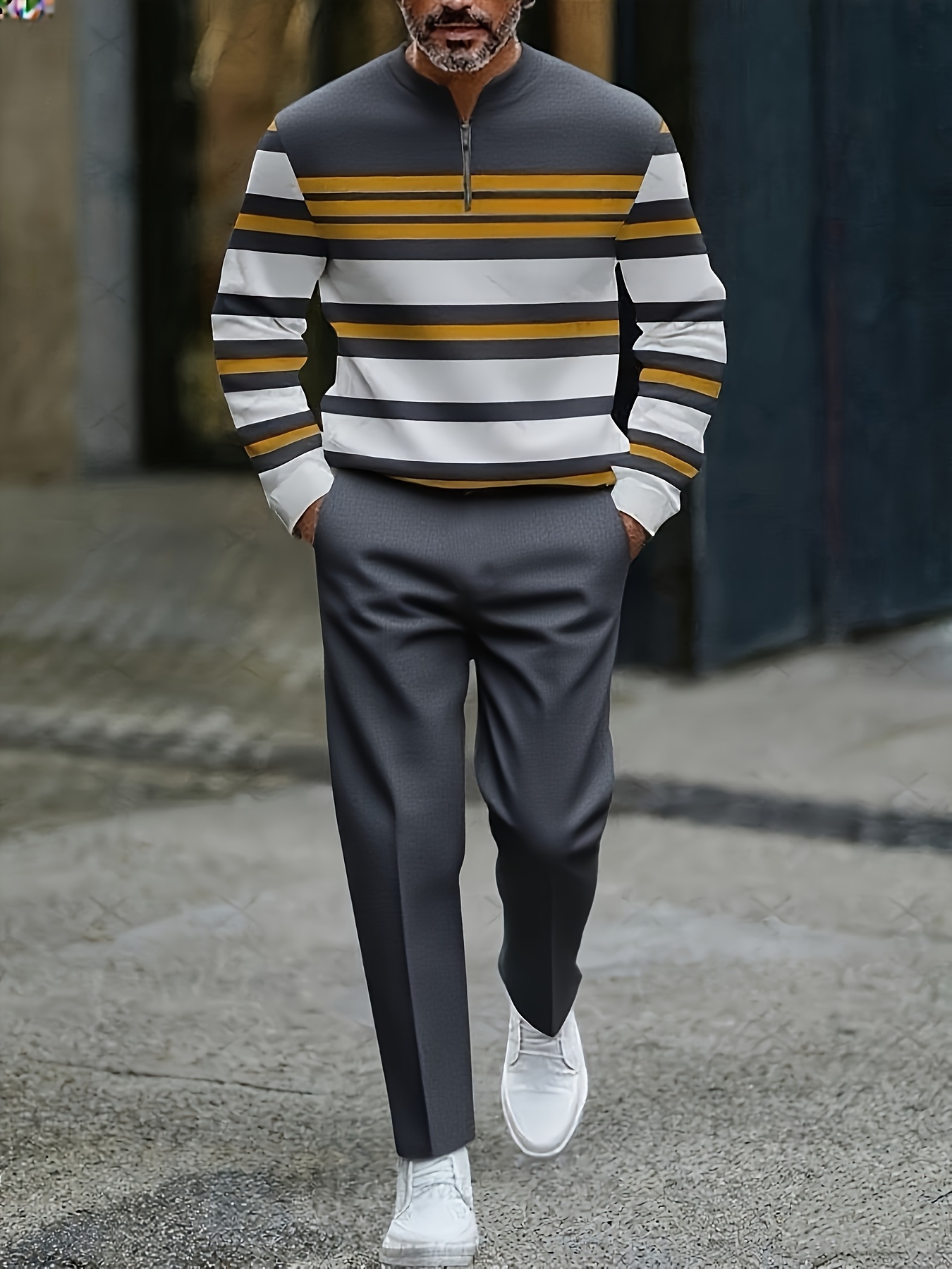 Men's Casual Green Color Matching Striped Printed Round-Neck Zipper Long Sleeved Trousers Two-Piece Set