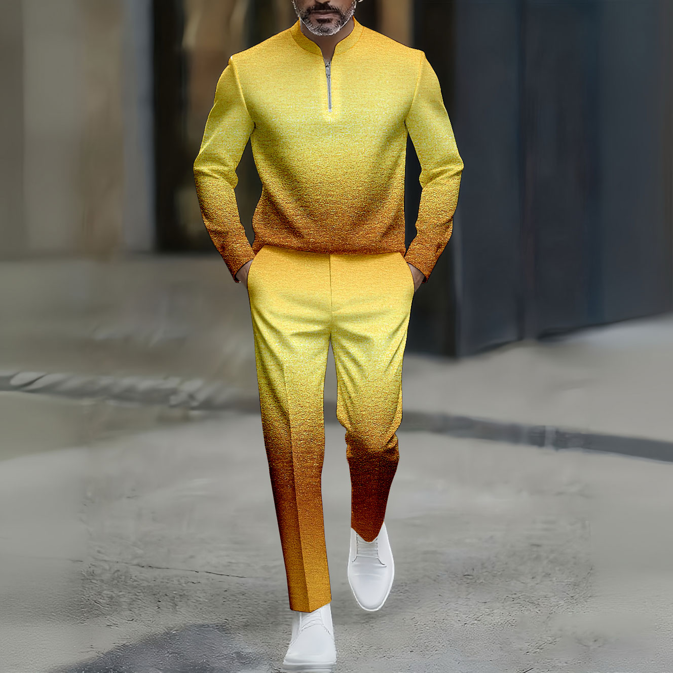 Men's Casual Gold Gradient Color Round-Neck Zipper Long Sleeved Trousers Two-Piece Set