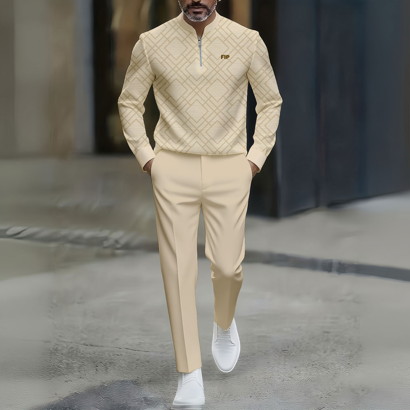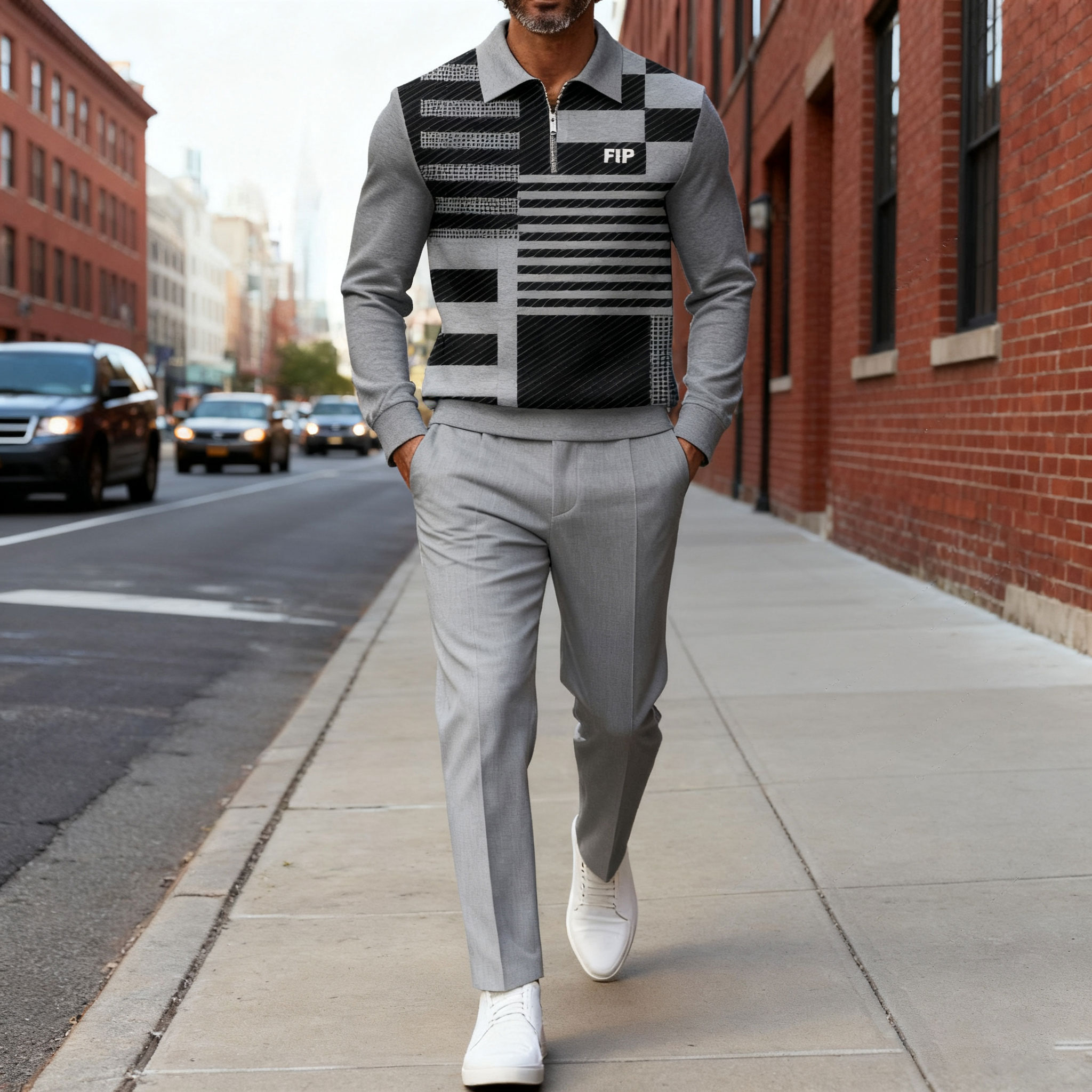 Men's Casual Gray Color Matching Geometric Printed Polo-Collar Zipper Long Sleeved Trousers Two-Piece Set