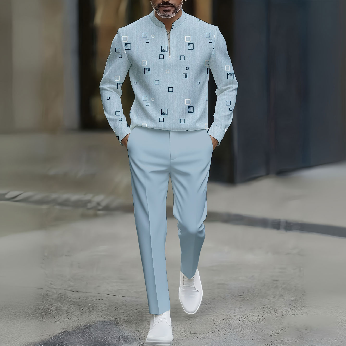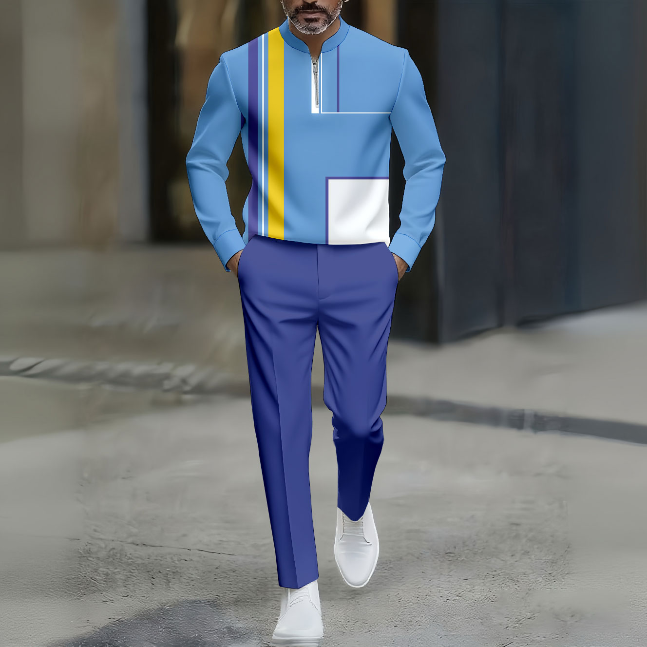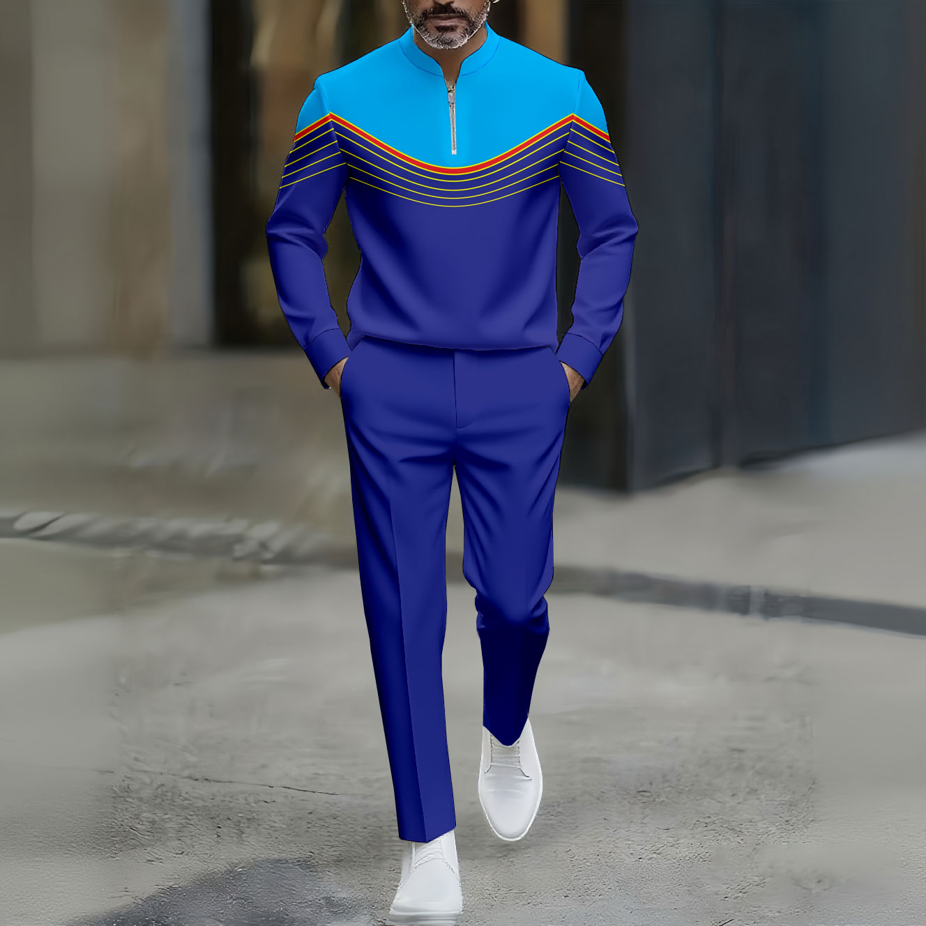 Men's Casual Blue Color Matching Geometric Printed Round-Neck Zipper Long Sleeved Trousers Two-Piece Set