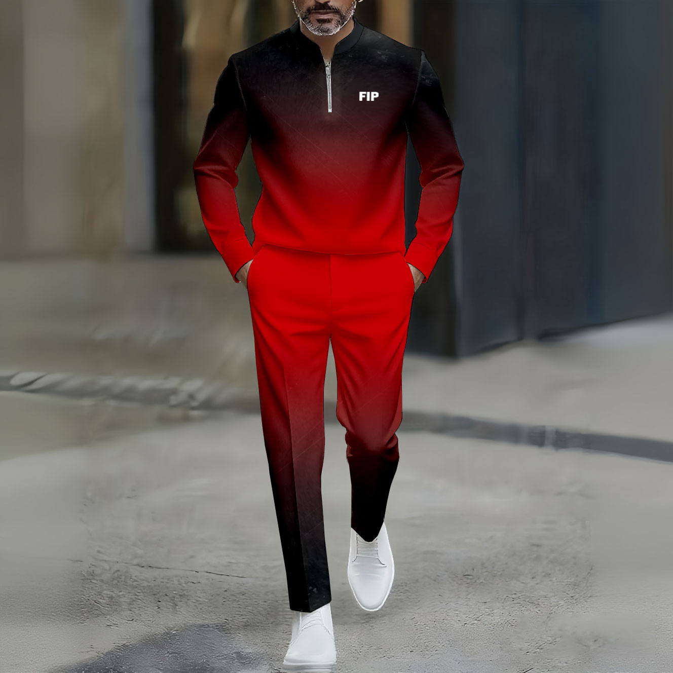 Men's Casual Black & Red Gradient Color Matching Printed Round-Neck Zipper Long Sleeved Trousers Two-Piece Set