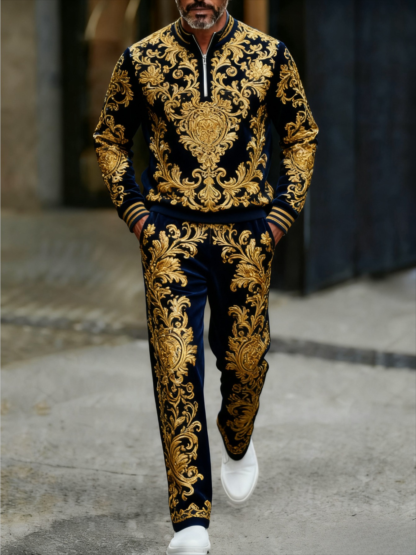 Men's Casual Gold & Black Color Matching Flower Printed Round-Neck Zipper Long Sleeved Trousers Two-Piece Set