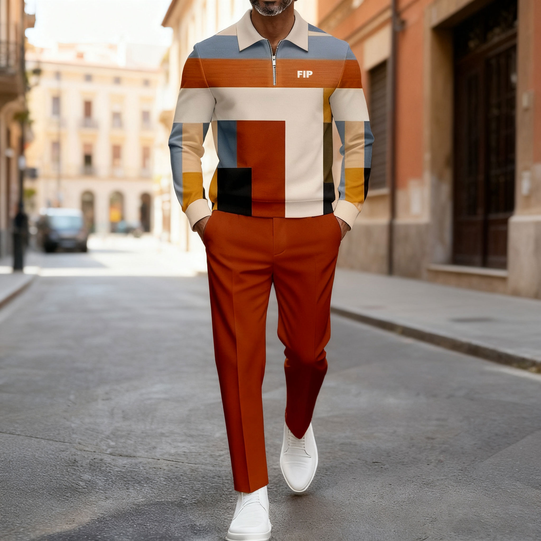 Men's Casual Orange Color Matching Geometric Printed Polo-Collar Zipper Long Sleeved Trousers Two-Piece Set