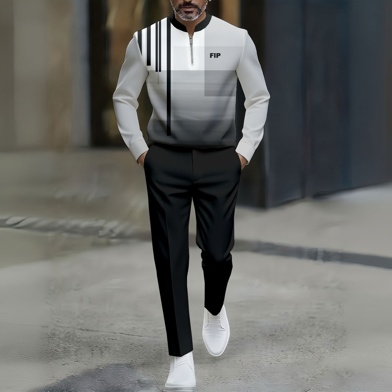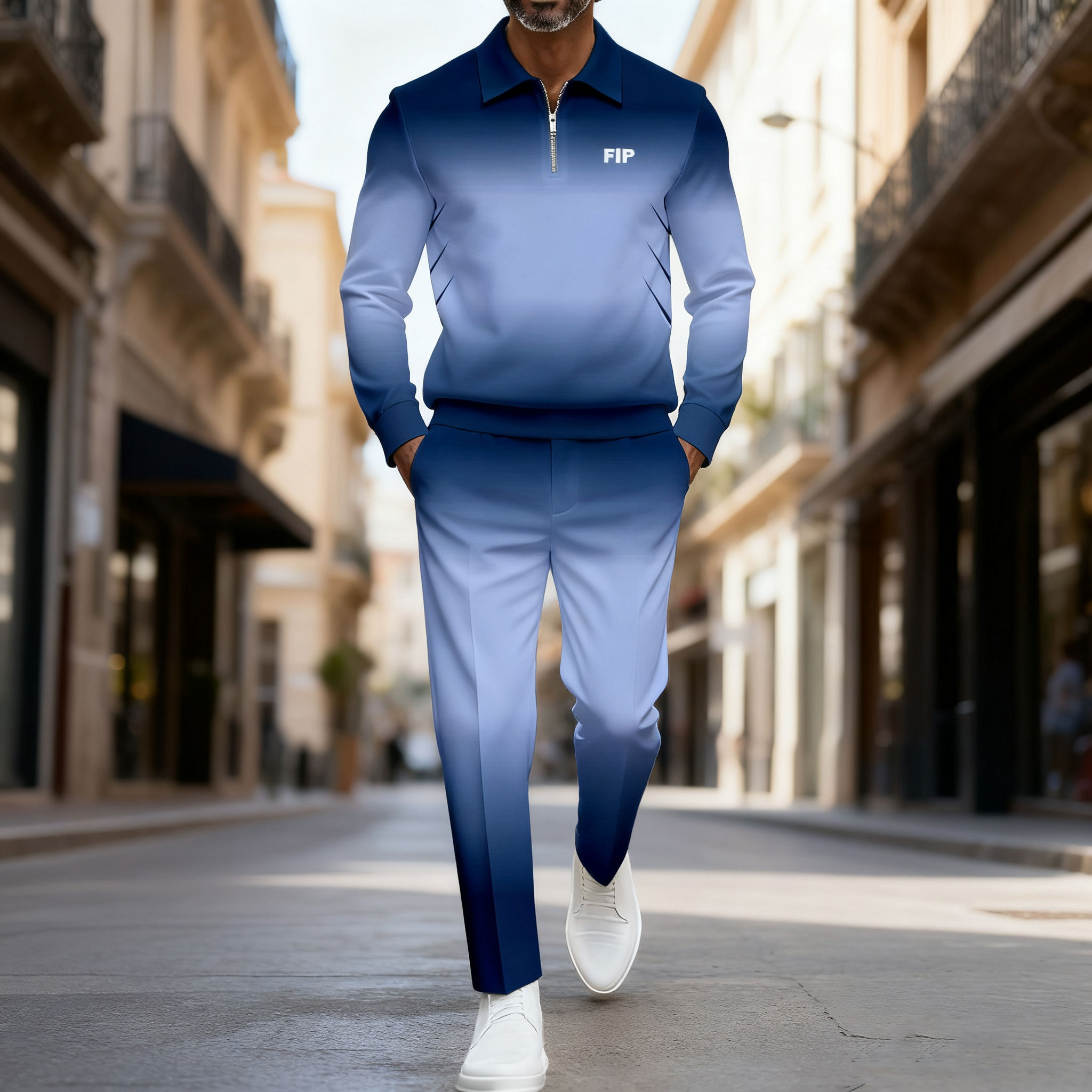 Men's Casual Gray Gradient Color Matching Printed Polo-Collar Zipper Long Sleeved Trousers Two-Piece Set