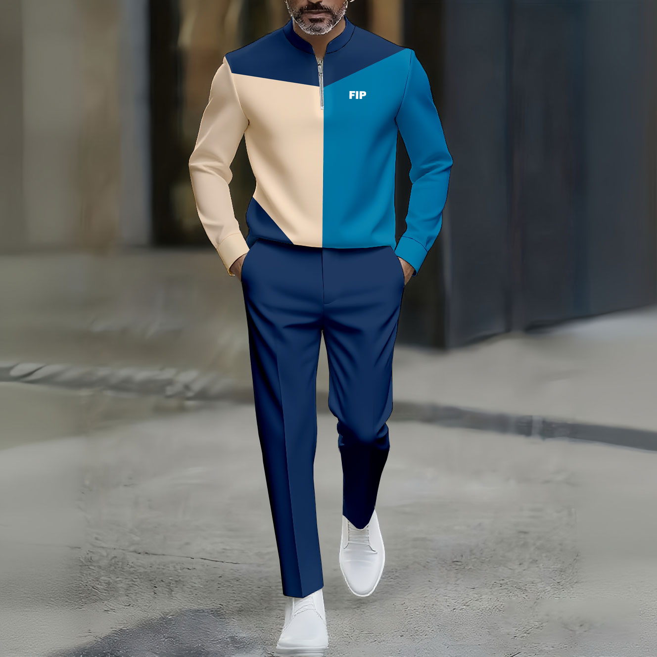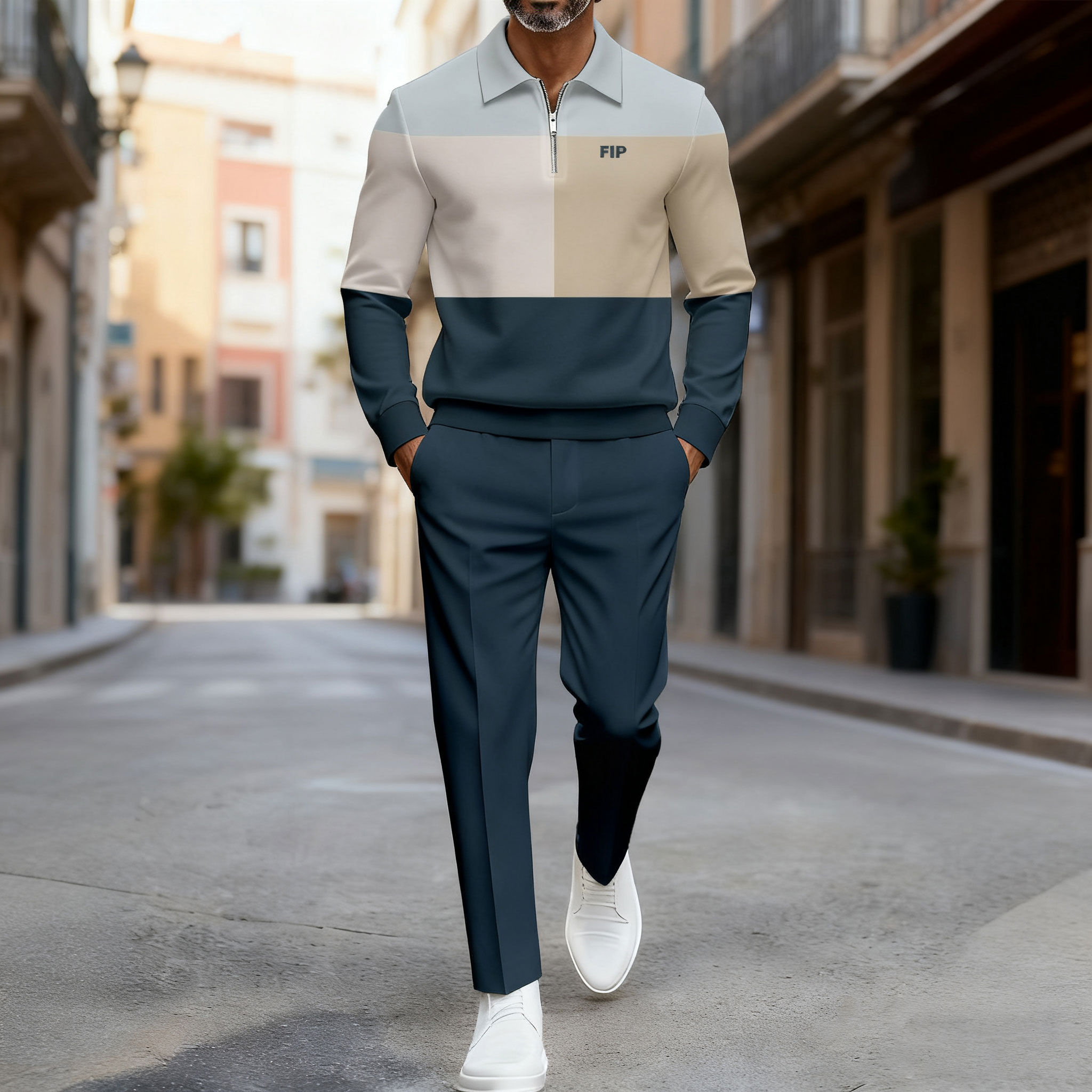 Men's Casual Blue & Apricot Color Matching Printed Polo-Collar Zipper Long Sleeved Trousers Two-Piece Set