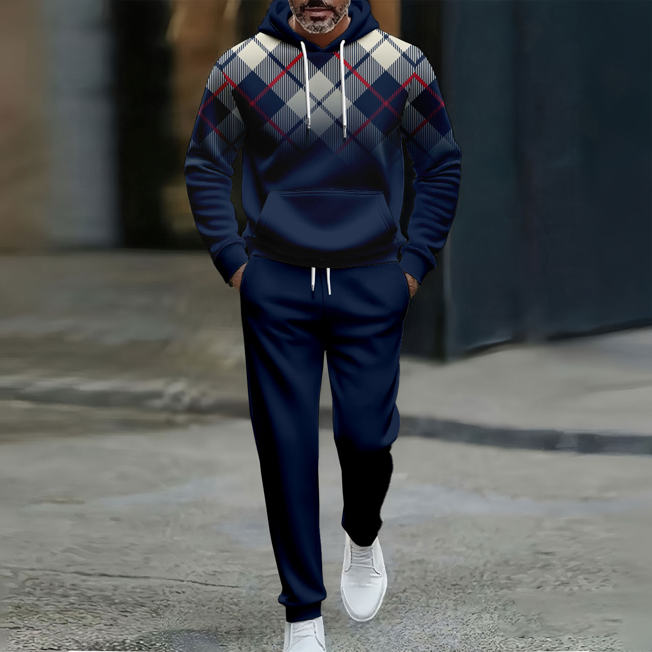 Men's Casual Color Matching Checked Gradient Printed Hooded Long Sleeved Trousers Navy Blue Two-Piece Set