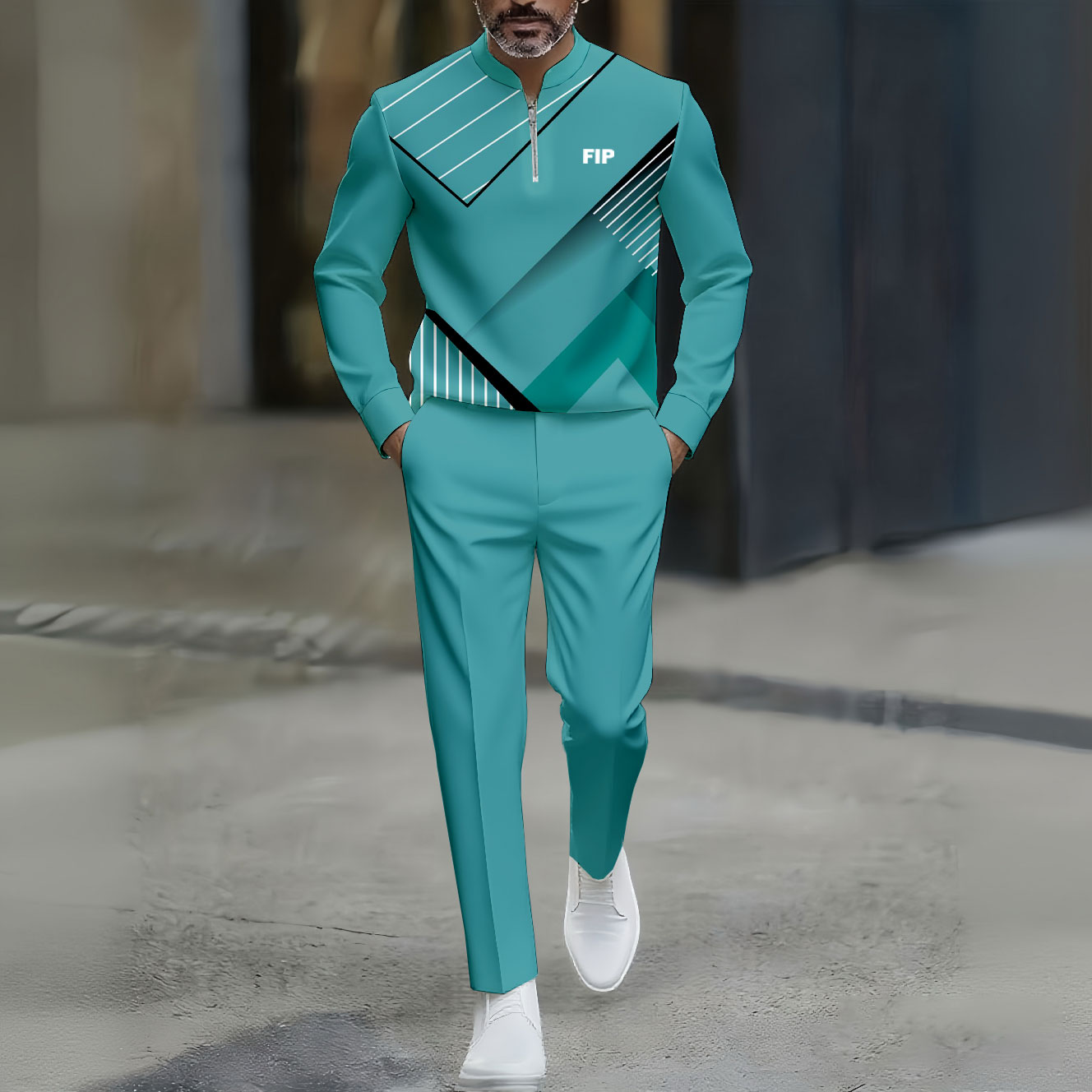 Men's Casual Blue Green Color Matching Geometric Printed Round-Neck Zipper Long Sleeved Trousers Two-Piece Set