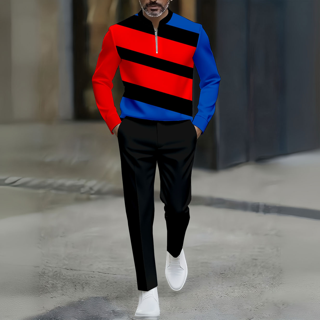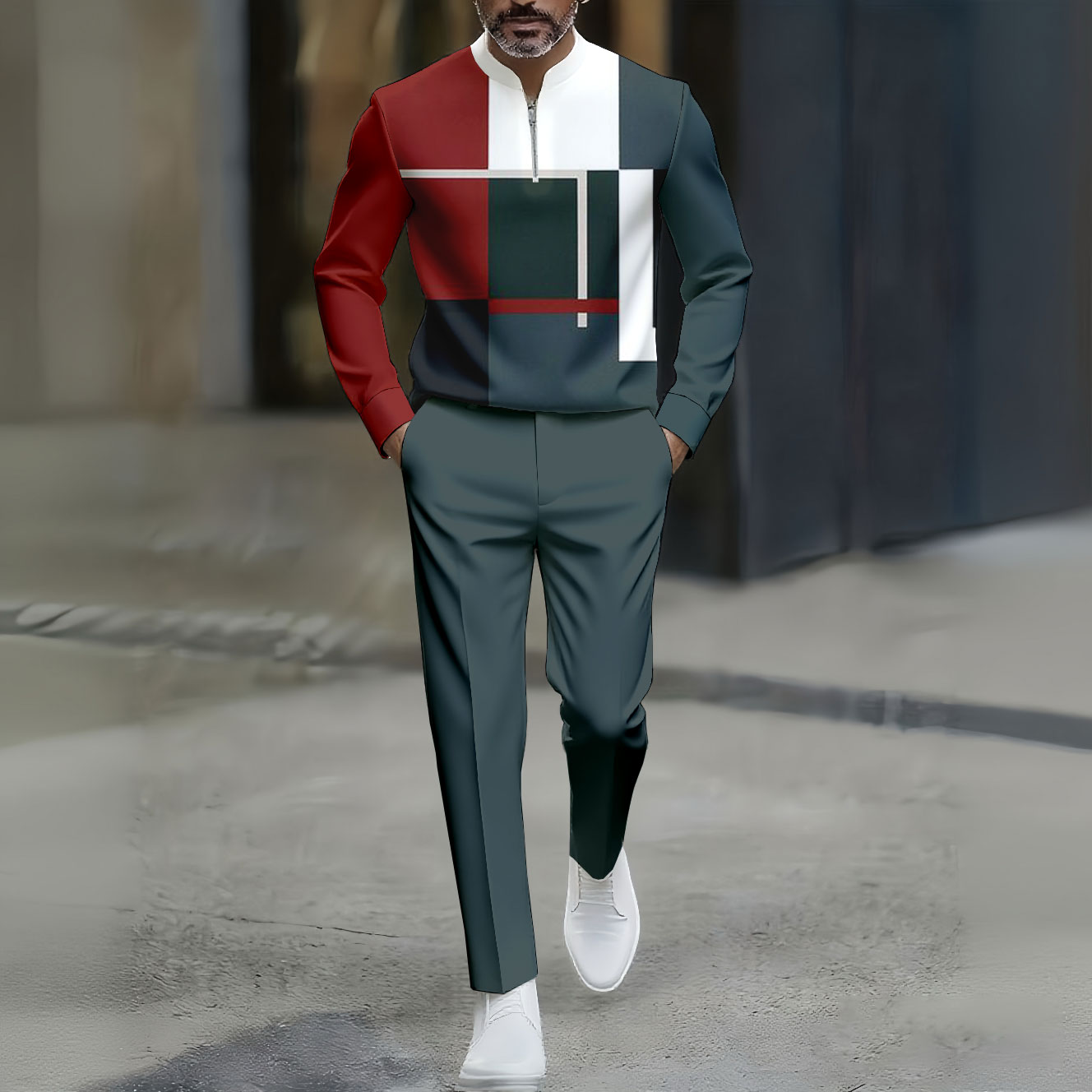 Men's Casual Red & Blue Color Matching Asymmetric Printed Polo-Collar Zipper Long Sleeved Trousers Two-Piece Set