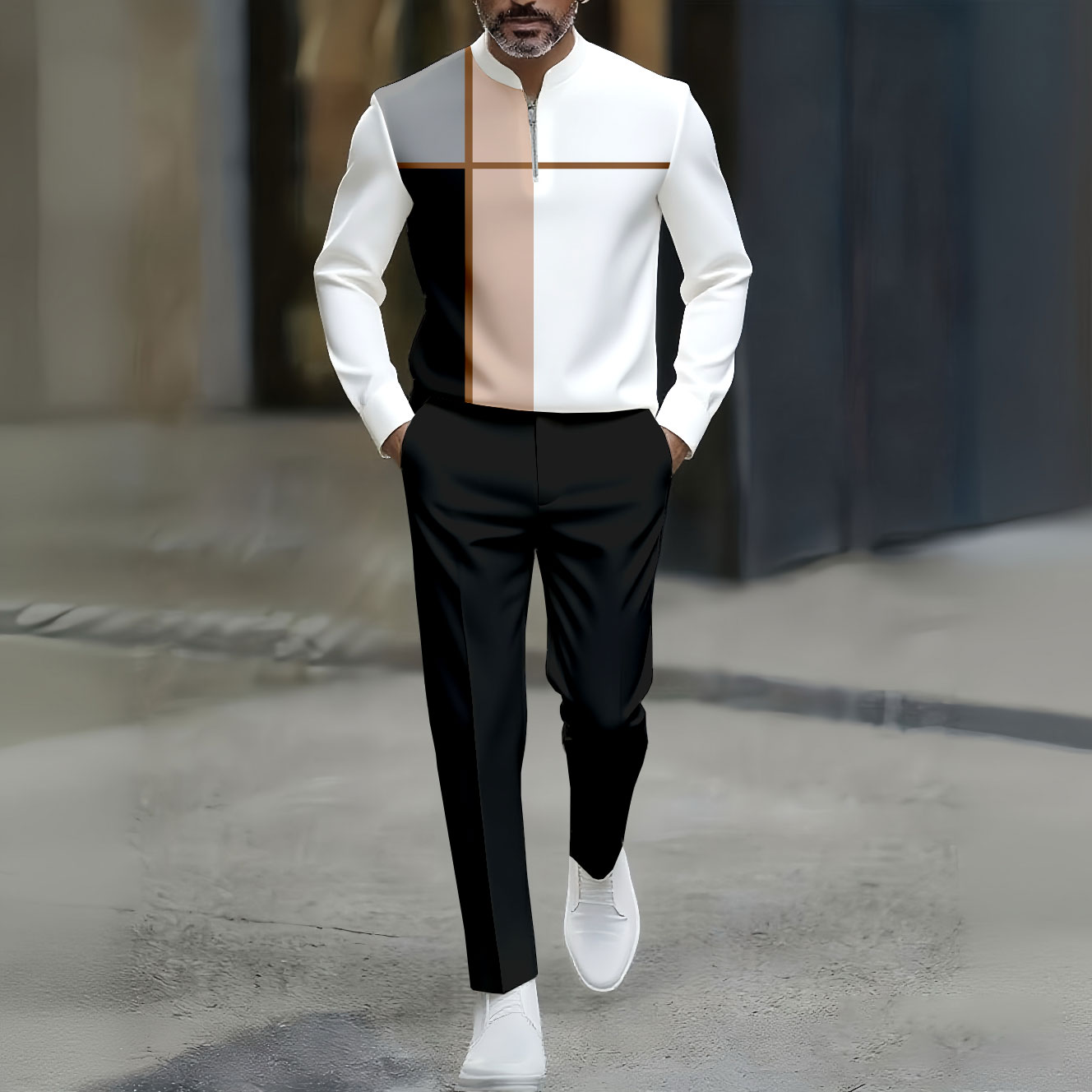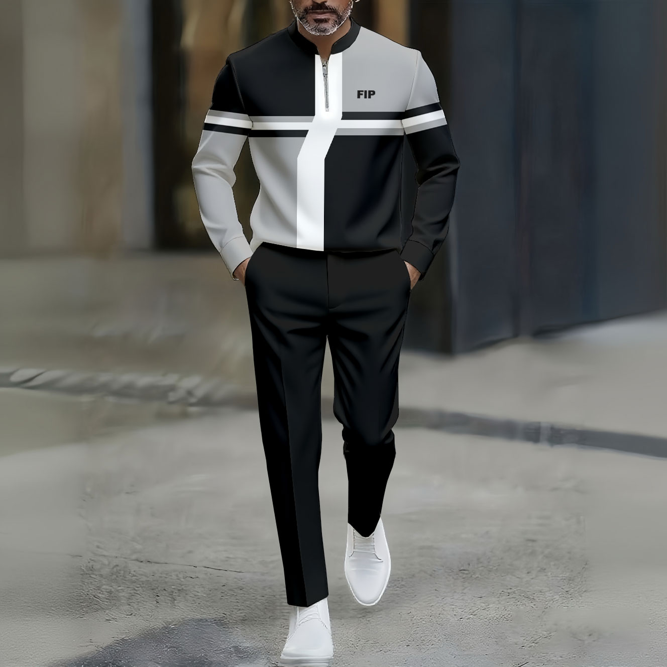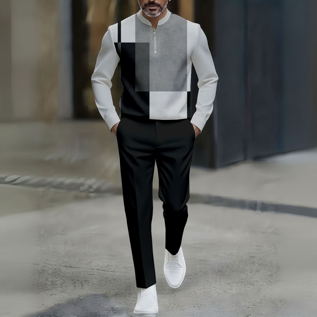 Men's Casual Black Gray White Color Matching Geometric Printed Round-Neck Zipper Long Sleeved Trousers Two-Piece Set