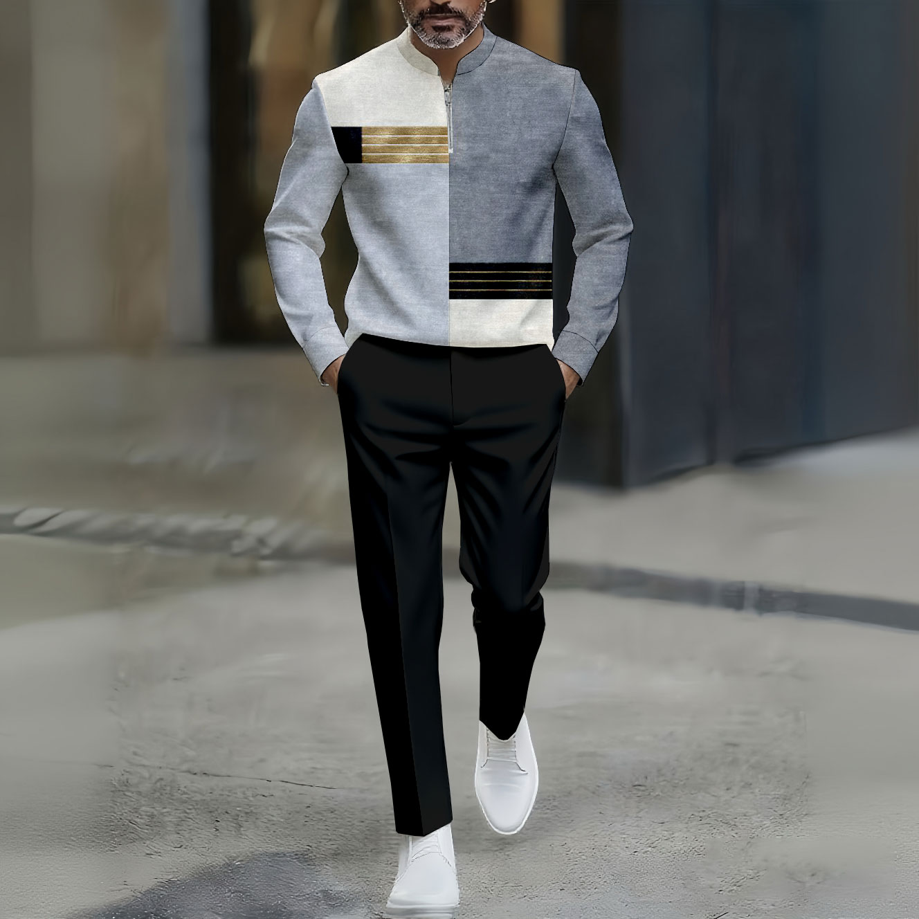 Men's Casual Gray & Gold Color Matching Asymmetric Striped Printed Round-Neck Zipper Long Sleeved Trousers Two-Piece Set