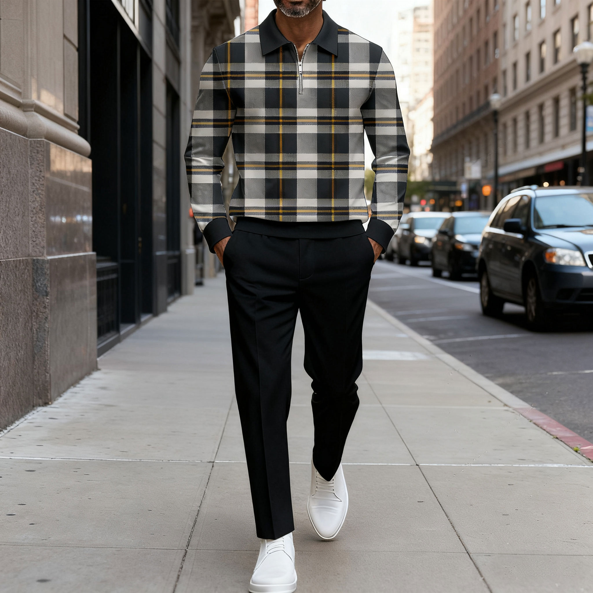 Men's Casual Color Matching Checked Printed Polo-Collar Zipper Long Sleeved Trousers Two-Piece Set