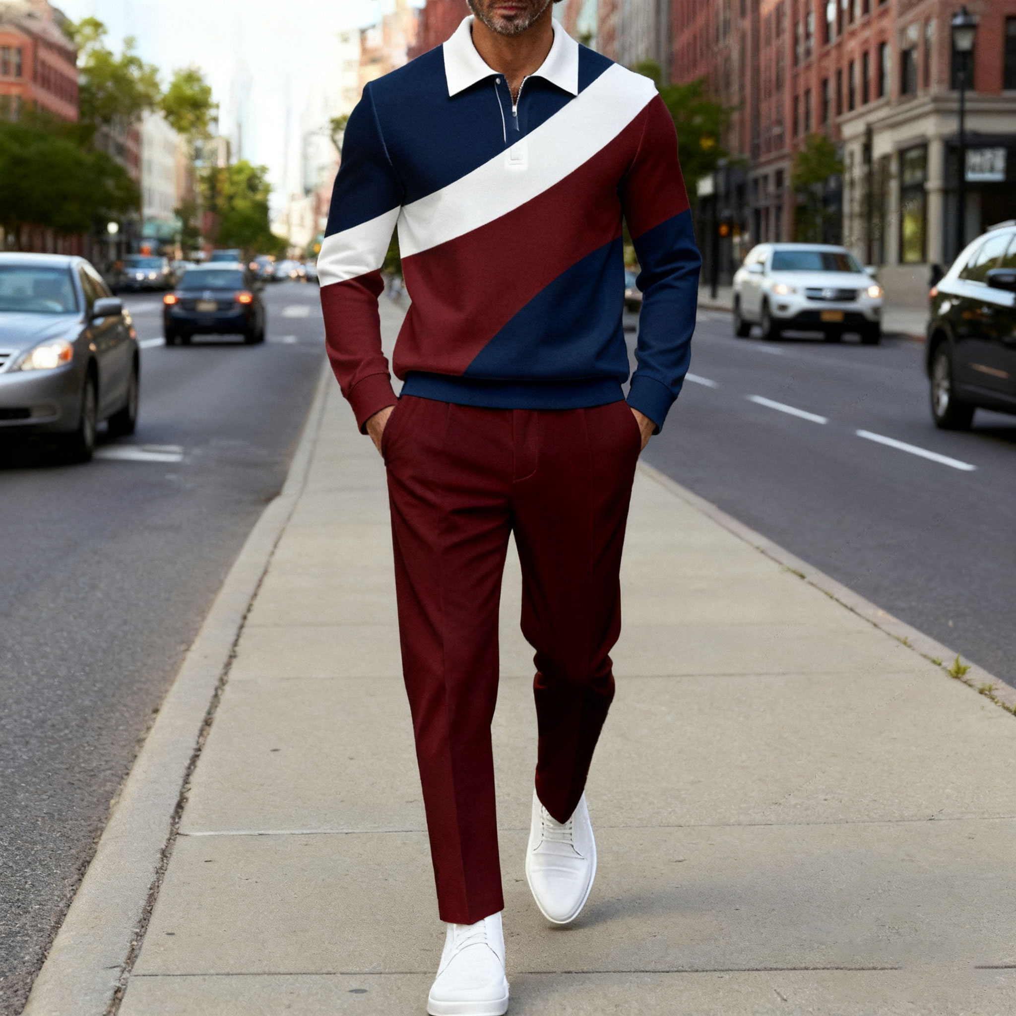 Men's Casual Maroon & White Color Matching Geometric Printed Polo-Collar Zipper Long Sleeved Trousers Two-Piece Set
