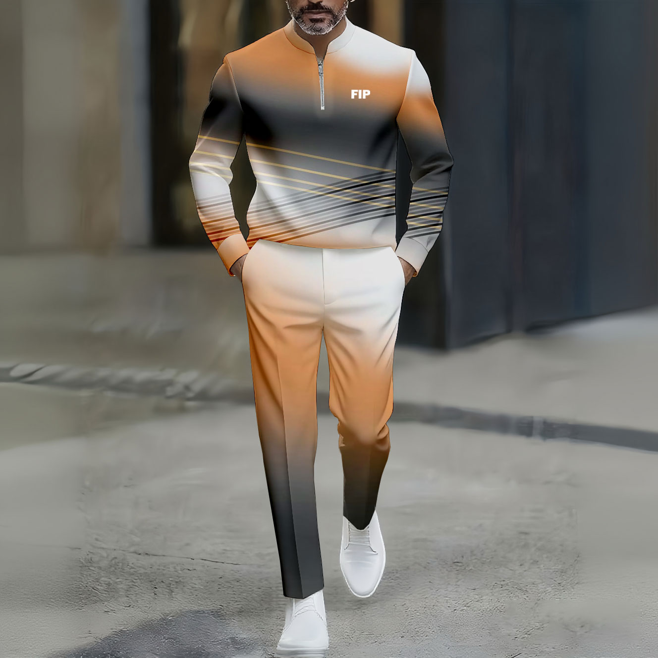 Men's Casual Orange Black And White Gradient Color Matching Printed Round-Neck Zipper Long Sleeved Trousers Two-Piece Set