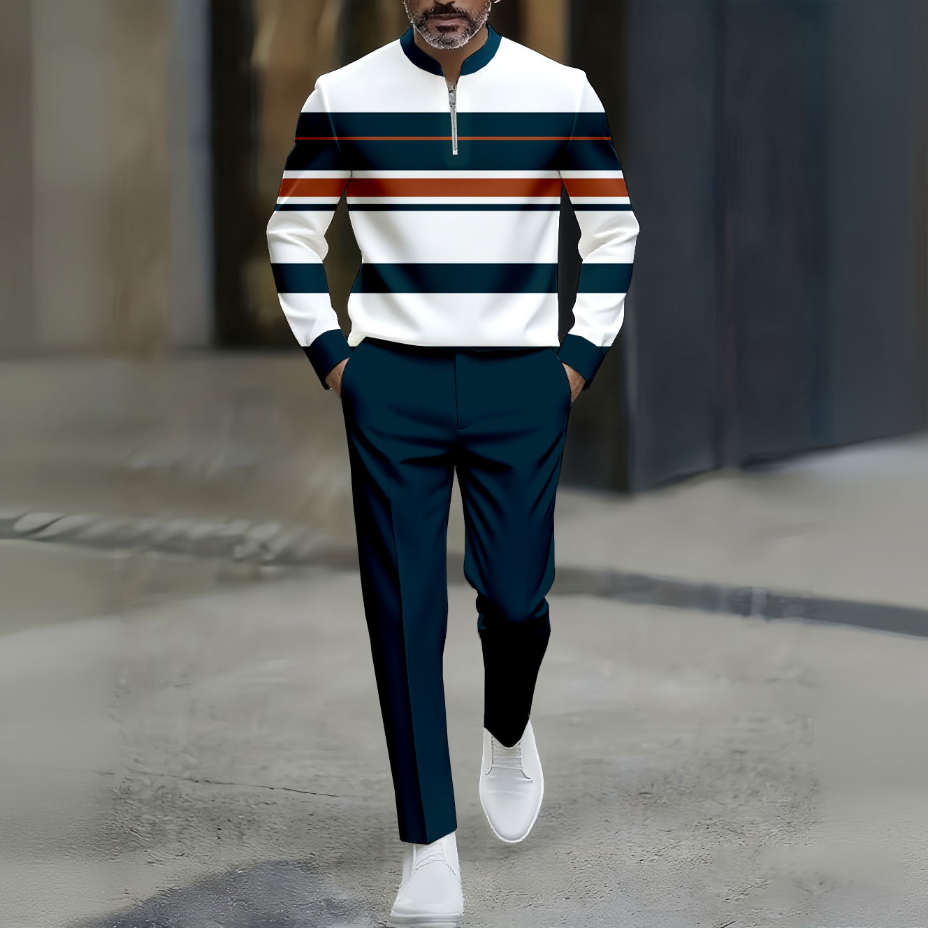 Men's Casual Khaki Color Matching Striped Printed Round-Neck Zipper Long Sleeved Trousers Two-Piece Set