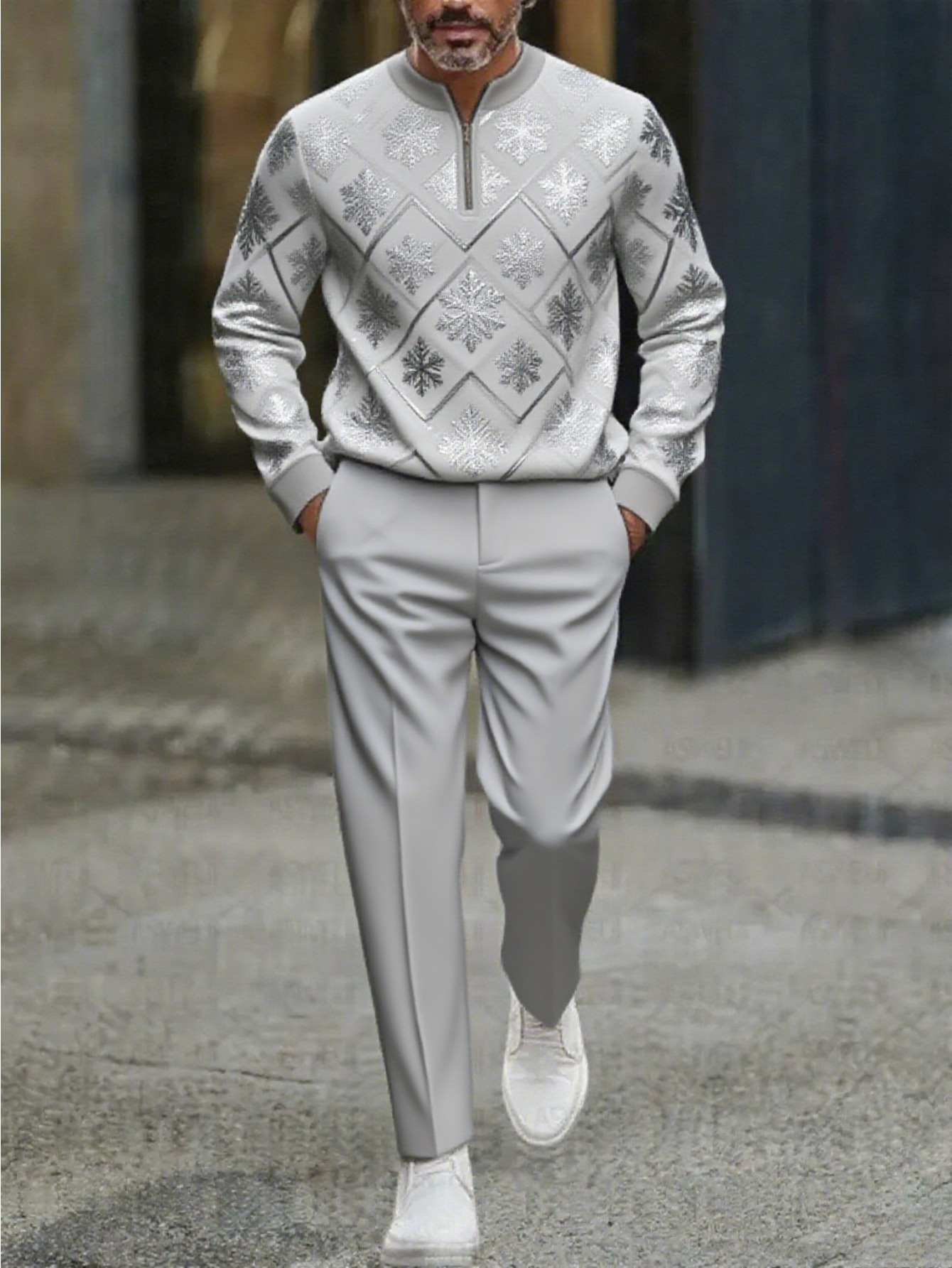 Men's Casual Silver Snowflake Printed Round-Neck Zipper Long Sleeved Trousers Two-Piece Set
