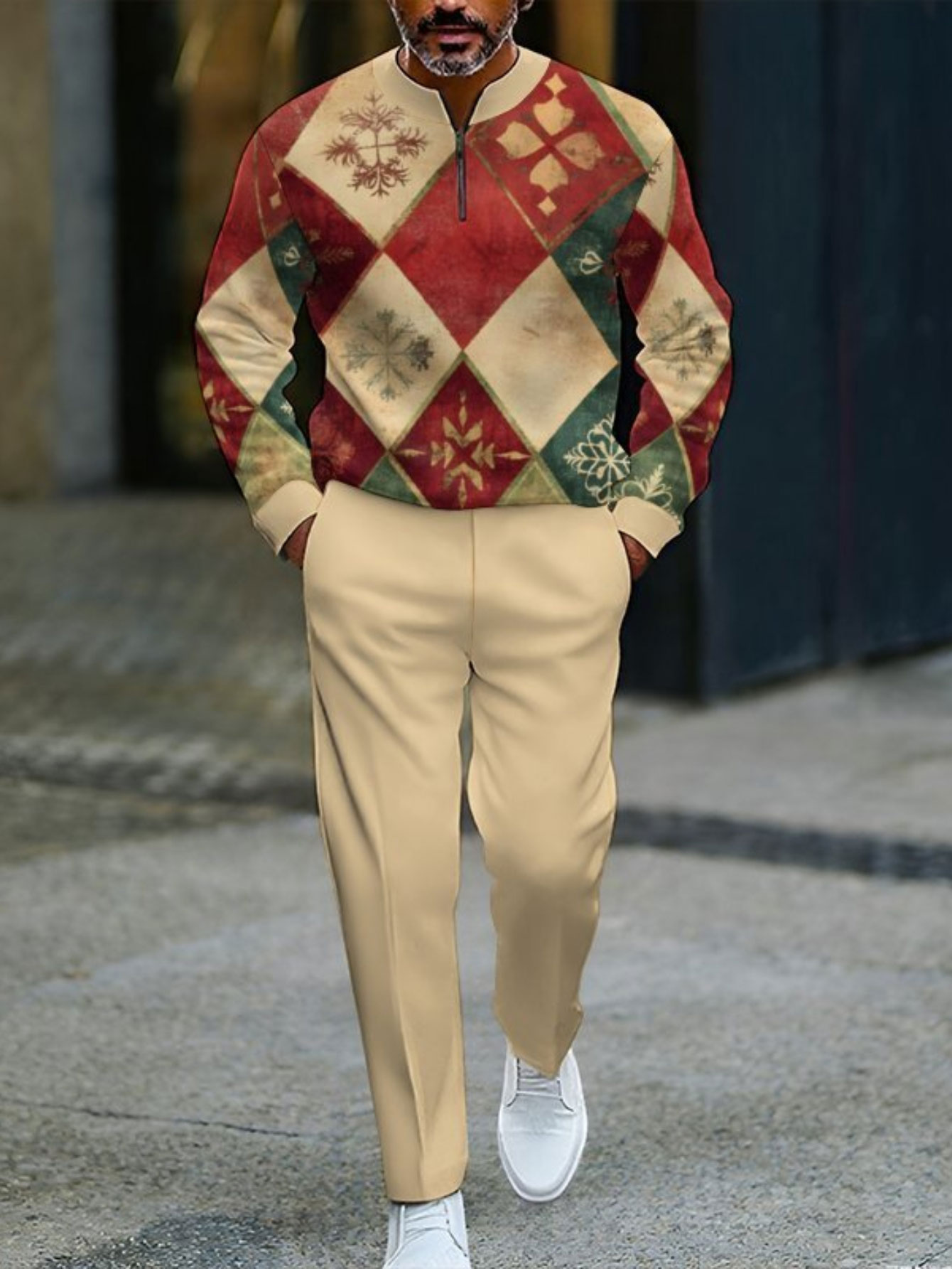 Men's Casual Christmas Printed Round-Neck Zipper Long Sleeved Trousers Two-Piece Set