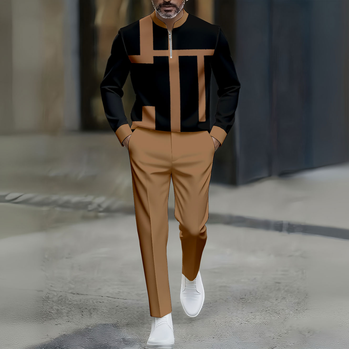 Men's Casual Brown Color Matching Geometric Printed Round-Neck Zipper Long Sleeved Trousers Two-Piece Set
