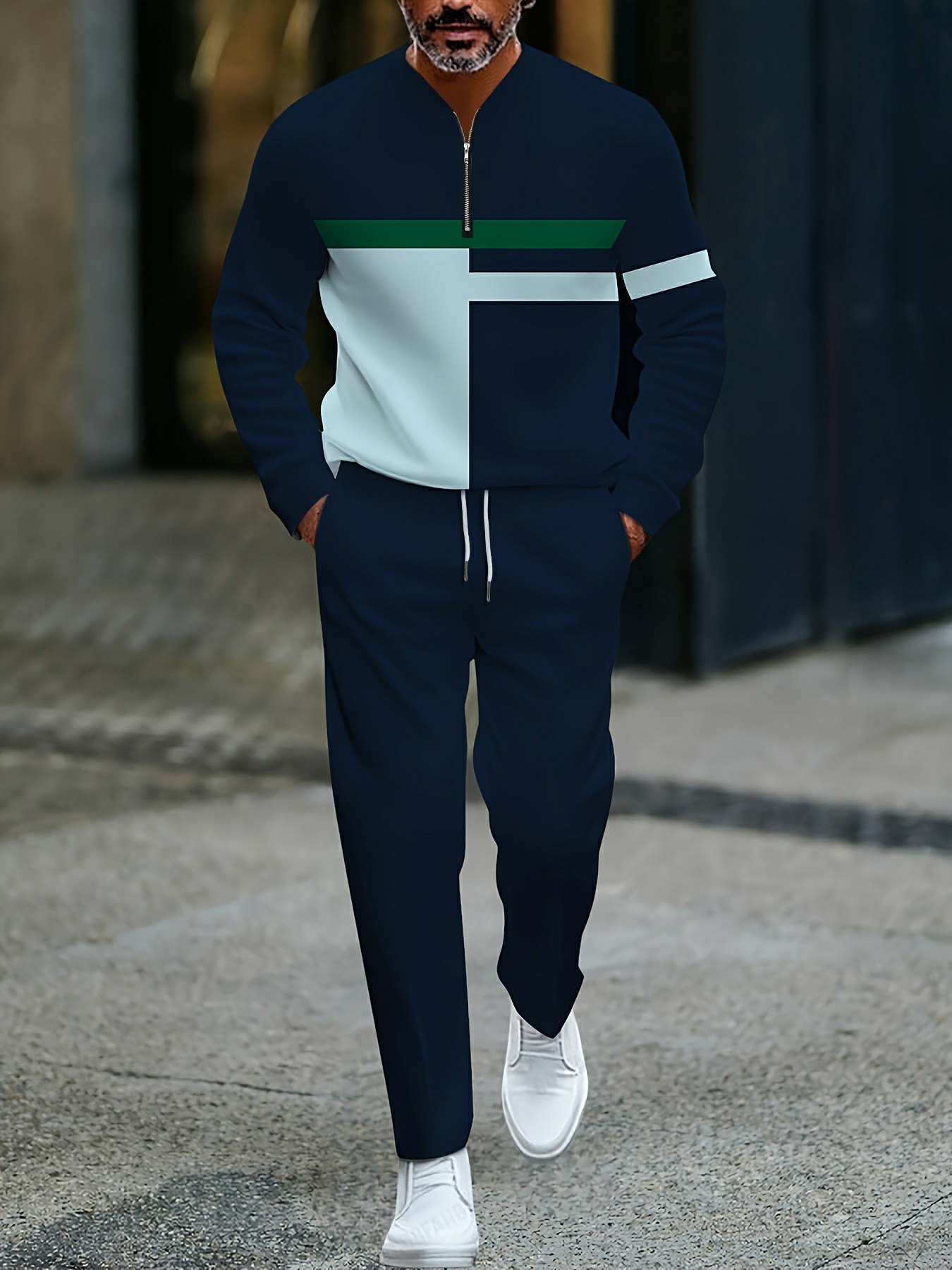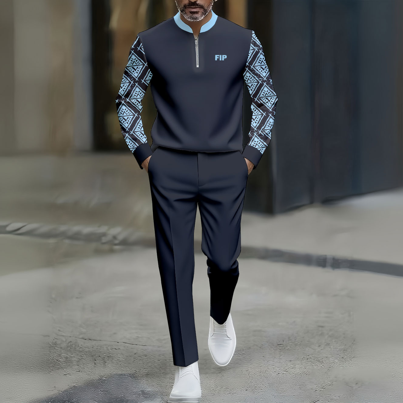 Men's Casual Navy Blue & White Color Matching Geometric Asymmetric Printed Round-Neck Zipper Long Sleeved Trousers Two-Piece Set