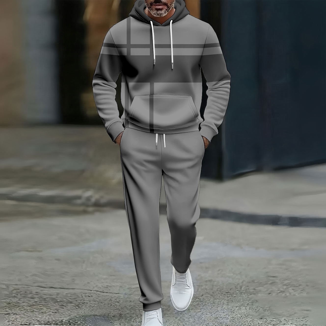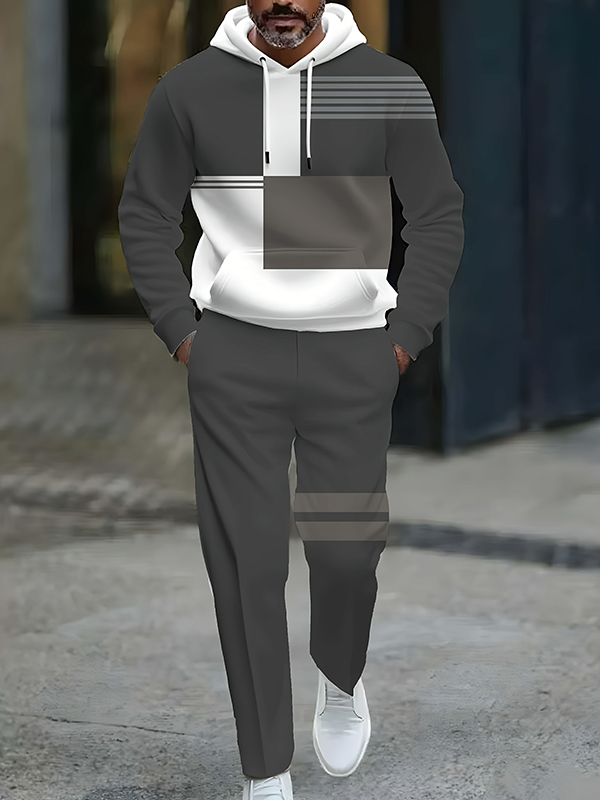 Men's Casual Gray Color Matching Geometric Printed Hooded Long Sleeved Trousers Two-Piece Set