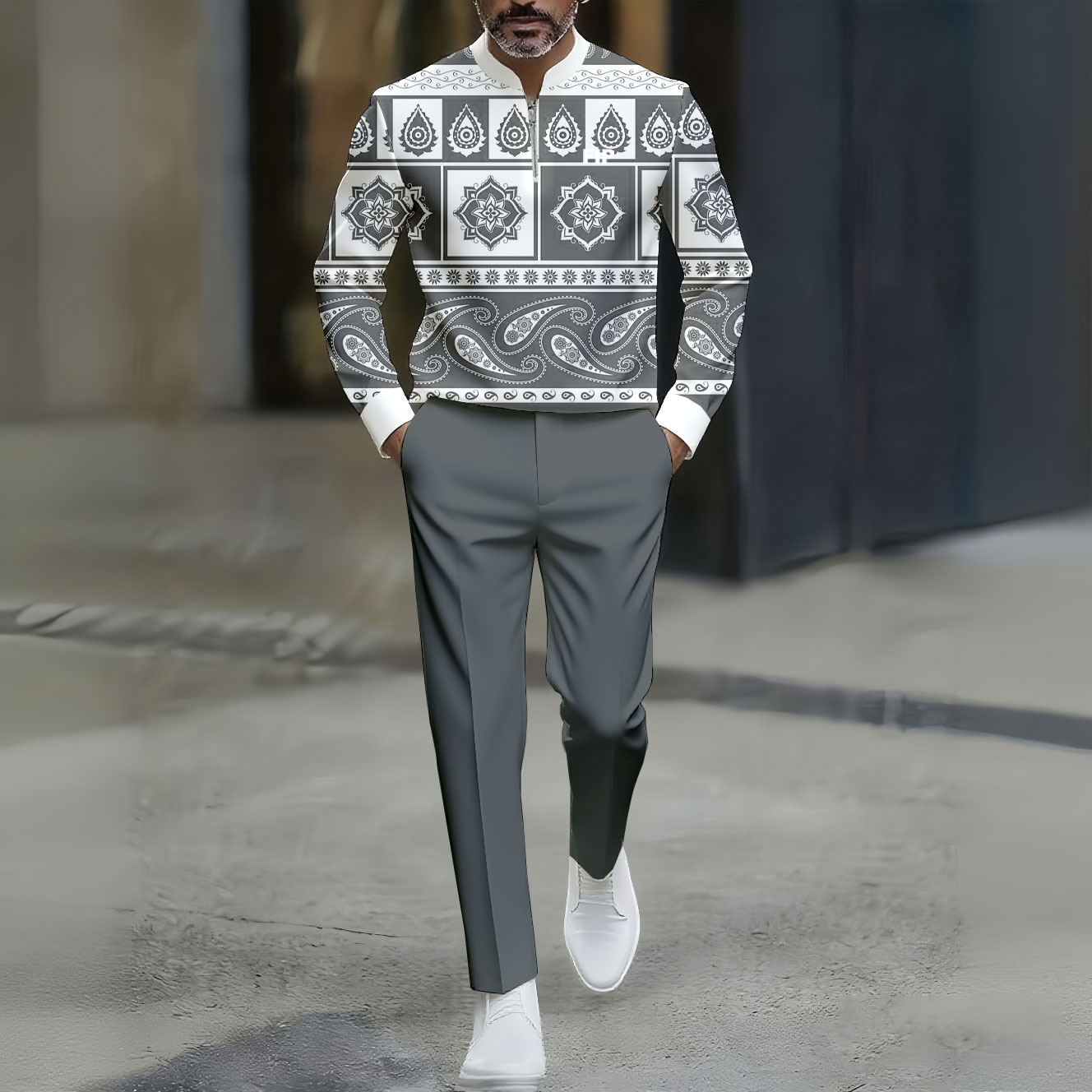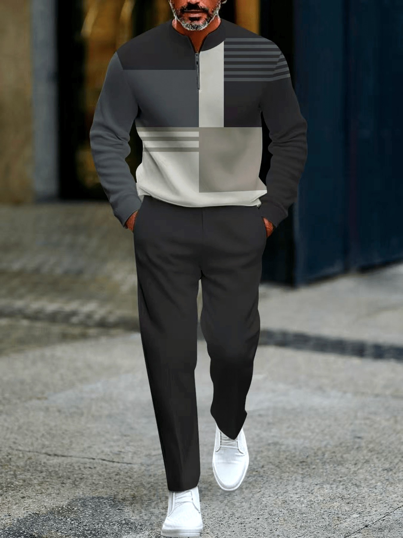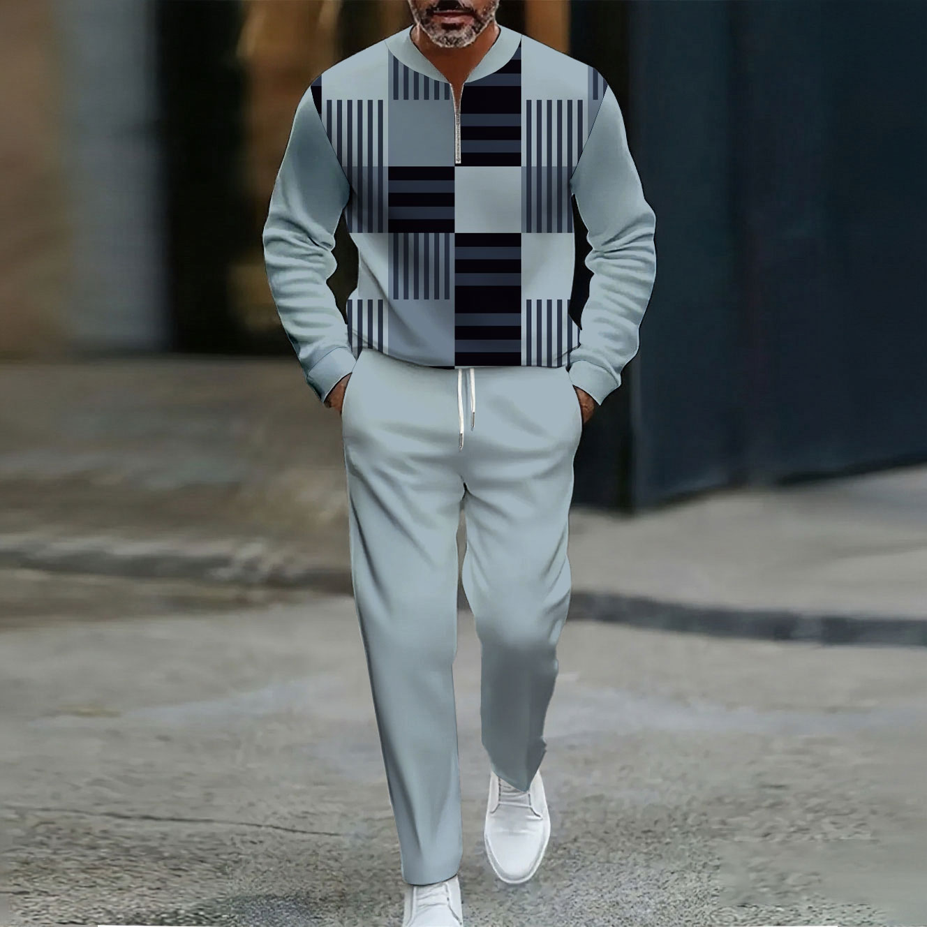 Men's Casual Gray Blue Color Matching Geometric Printed Round-Neck Zipper Long Sleeved Trousers Two-Piece Set