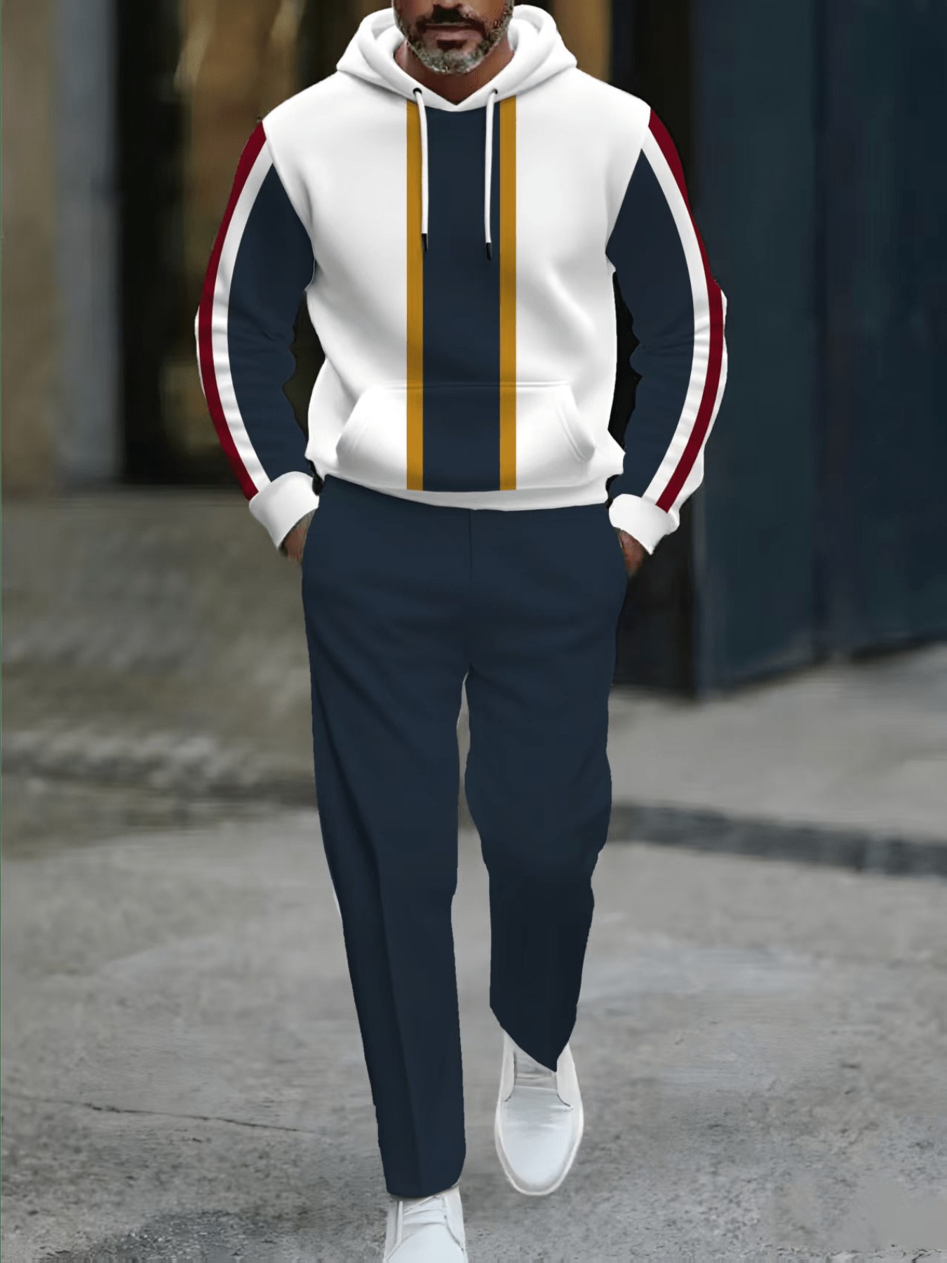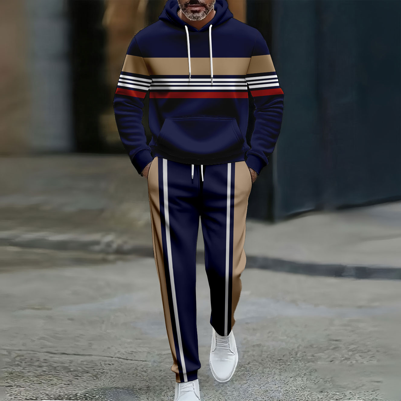 Men's Casual Color Matching Red Striped Printed Hooded Long Sleeved Trousers Apricot Two-Piece Set