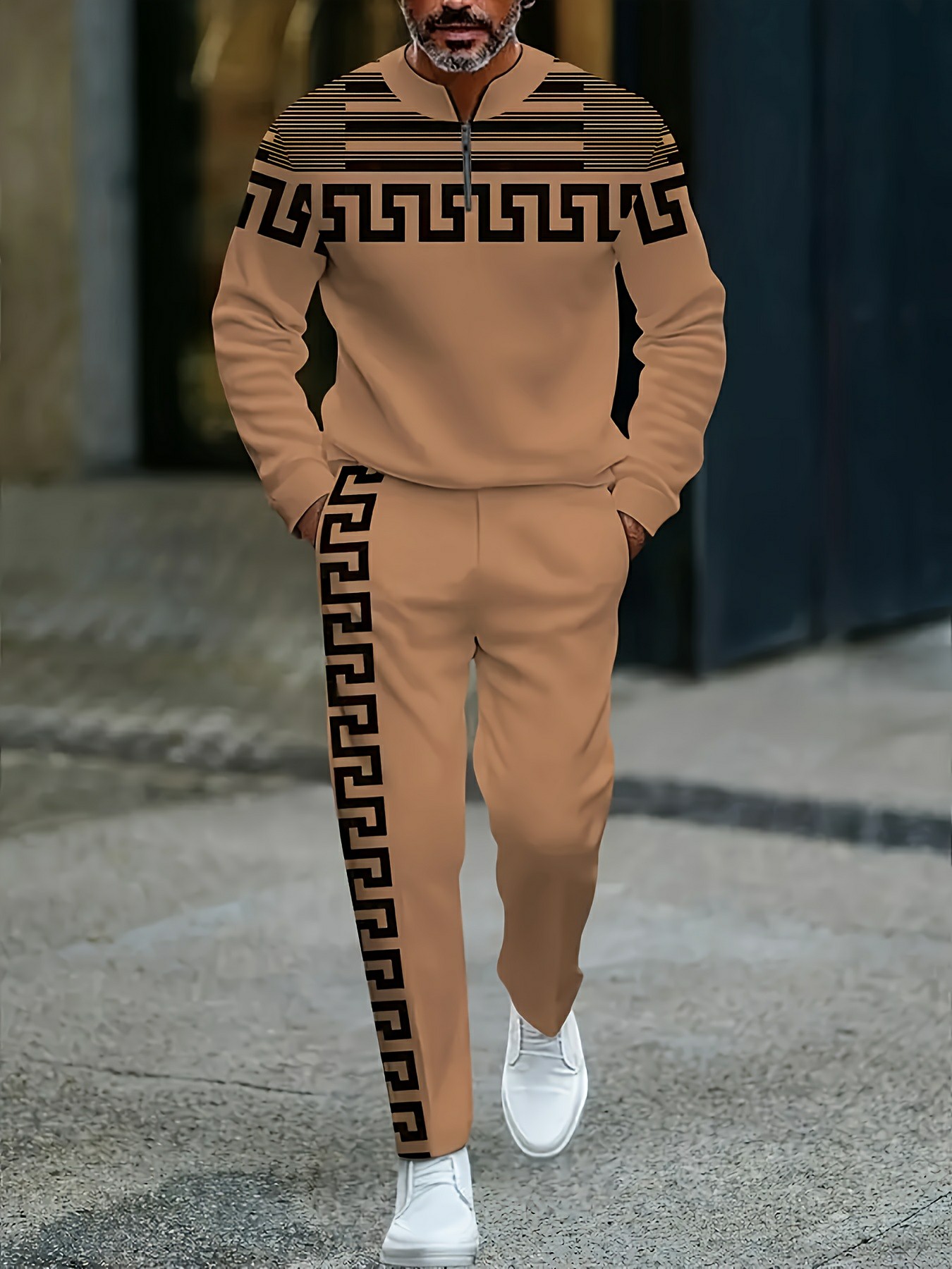 Men's Casual Apricot Color Matching Geometric Printed Round-Neck Zipper Long Sleeved Trousers Two-Piece Set