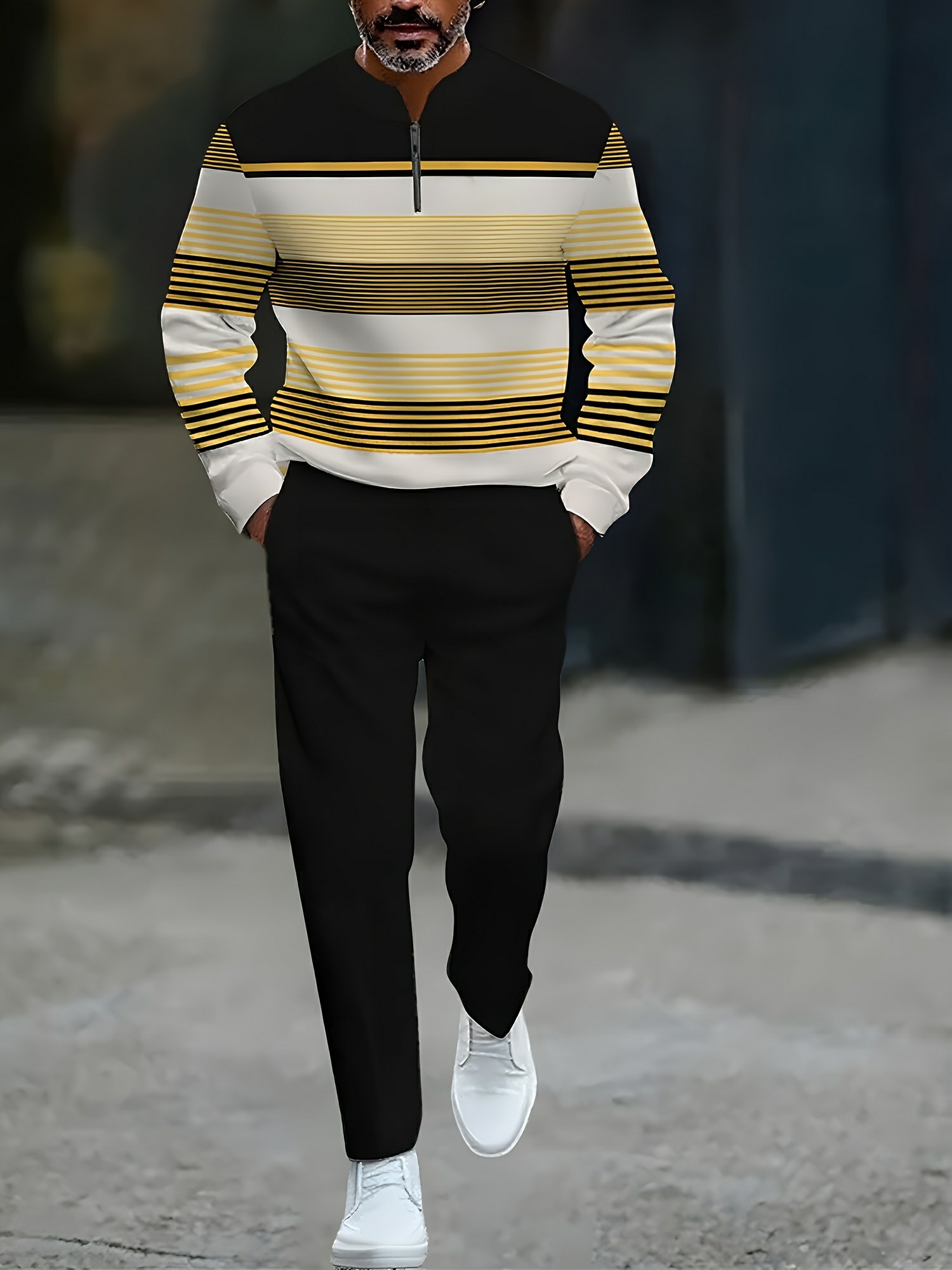 Men's Casual Yellow & White Color Matching Striped Printed Round-Neck Zipper Long Sleeved Trousers Two-Piece Set