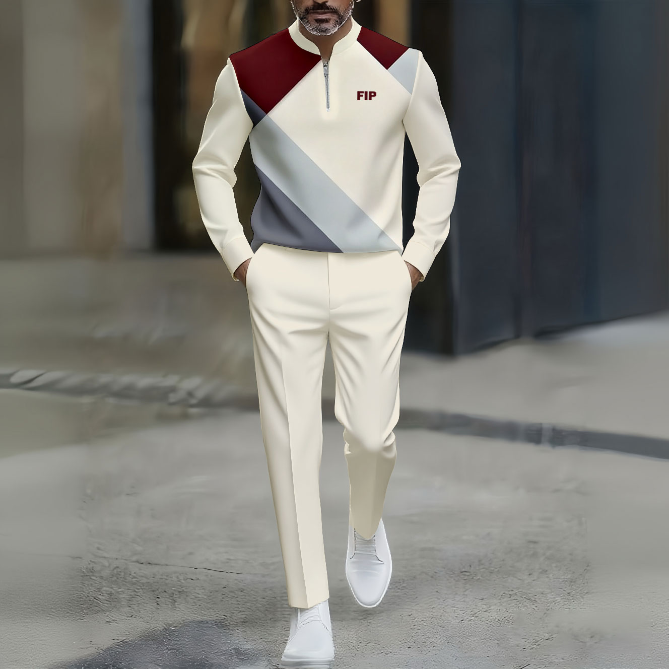 Men's Casual Maroon & White Color Matching Geometric Printed Round-Neck Zipper Long Sleeved Trousers Two-Piece Set