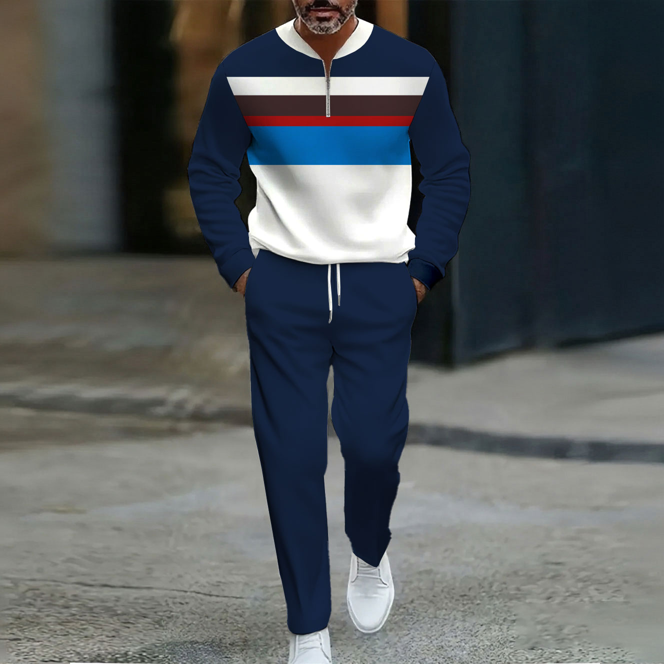 Men's Casual Navy Blue & Apricot Color Matching Striped Printed Round-Neck Zipper Long Sleeved Trousers Two-Piece Set