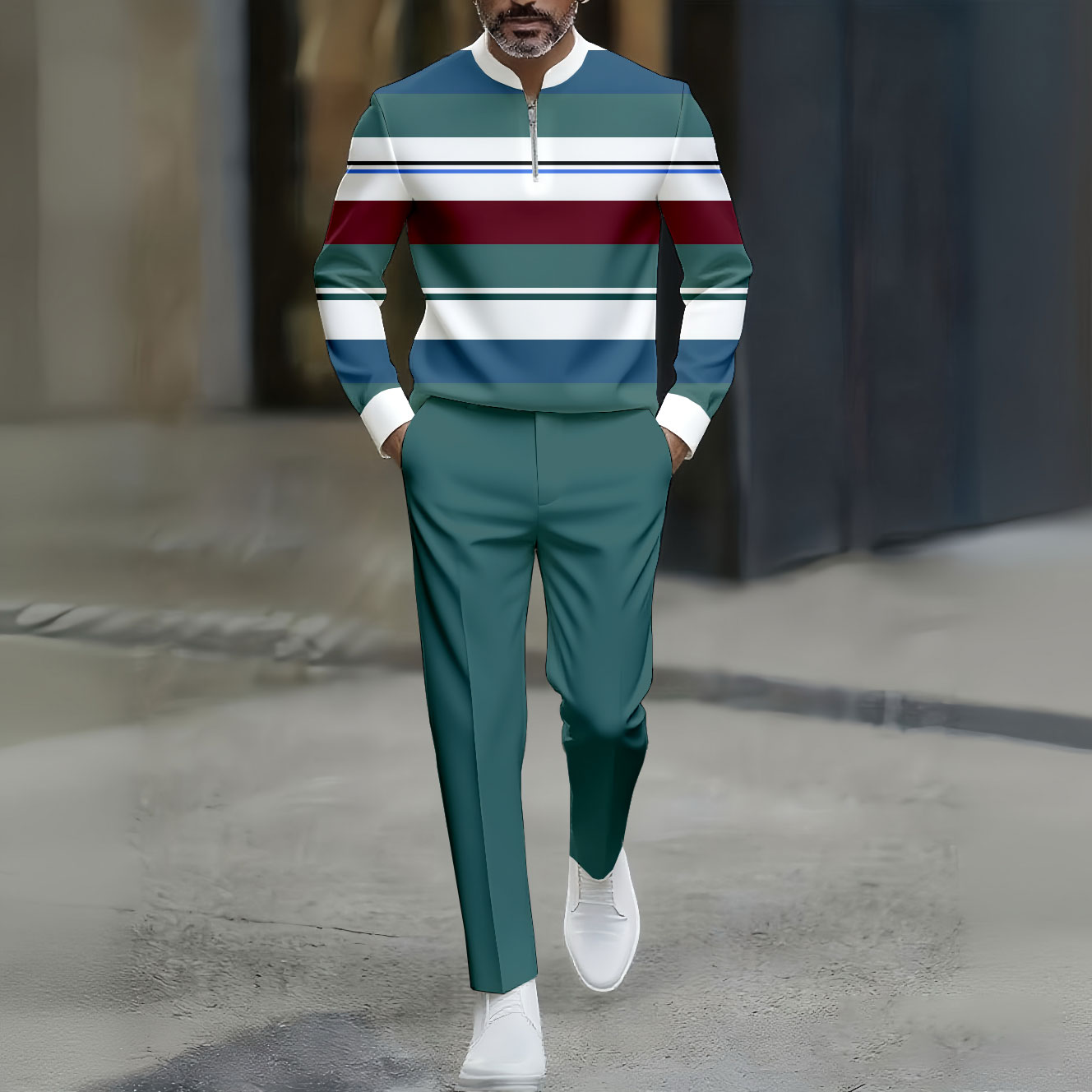 Men's Green & White Casual Color Matching Striped Printed Round-Neck Zipper Long Sleeved Trousers Two-Piece Set