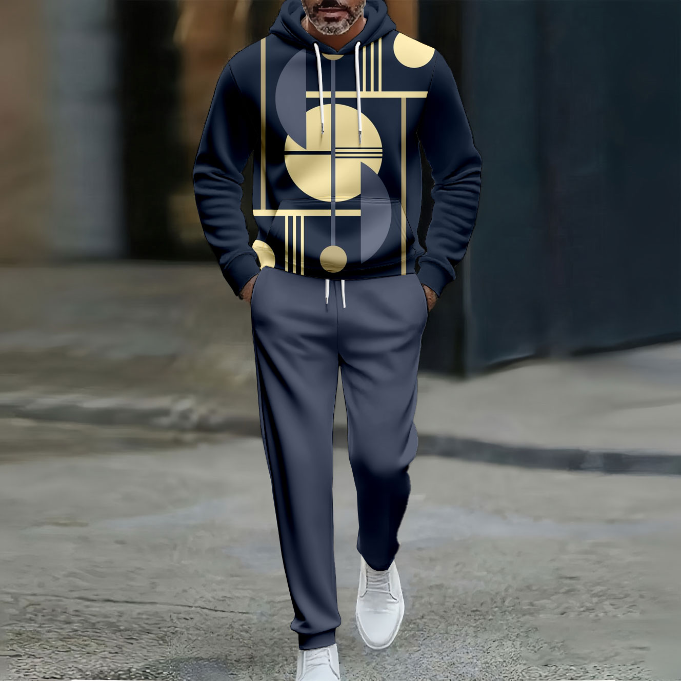 Men's Casual Color Matching Geometric Printed Hooded Long Sleeved Trousers Navy Blue Two-Piece Set