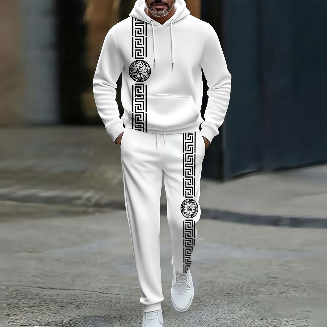 Men's Casual Color Matching Geometric Asymmetric Printed Hooded Long Sleeved Trousers White Two-Piece Set