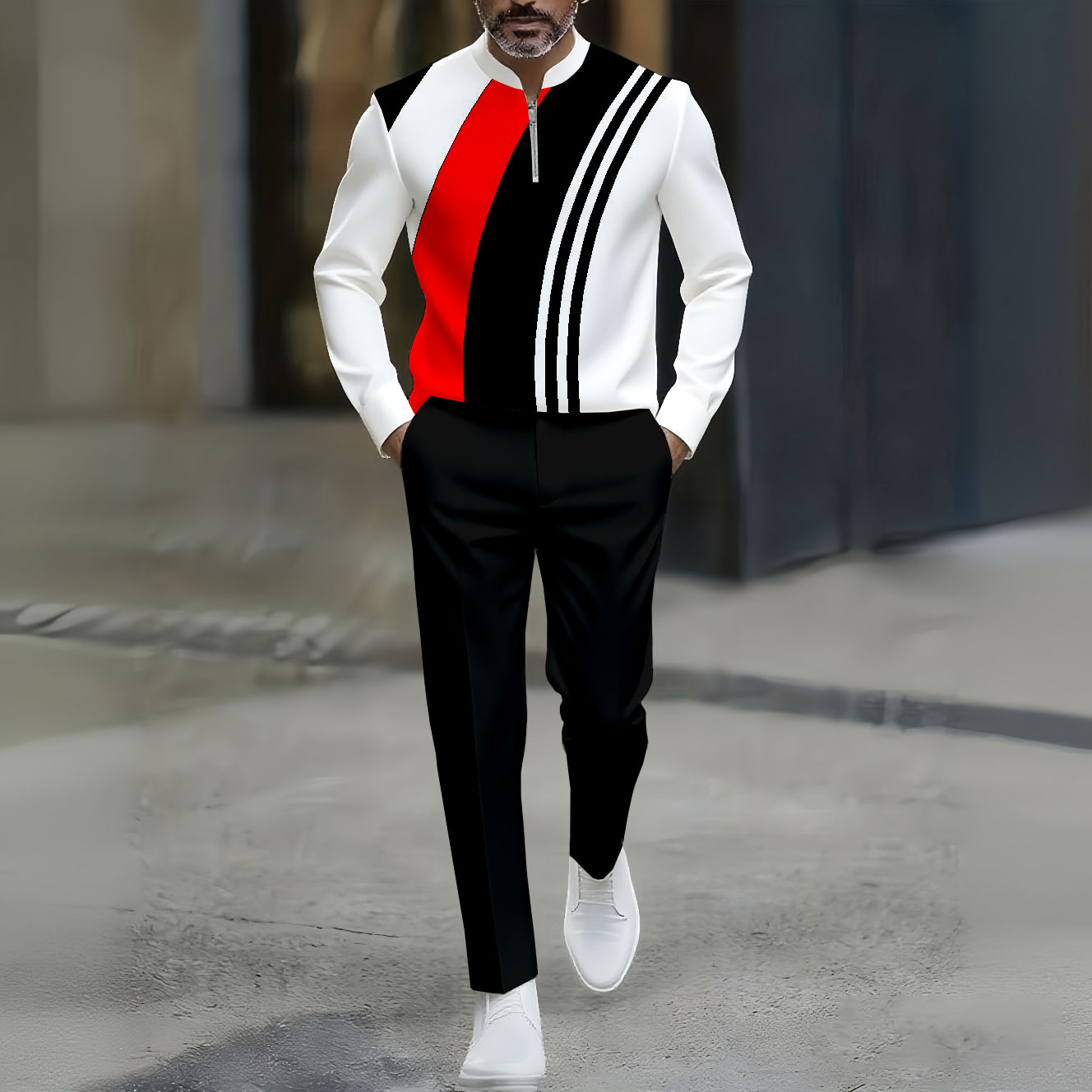 Men's Casual Black & White Color Matching Asymmetric Striped Printed Round-Neck Zipper Long Sleeved Trousers Two-Piece Set