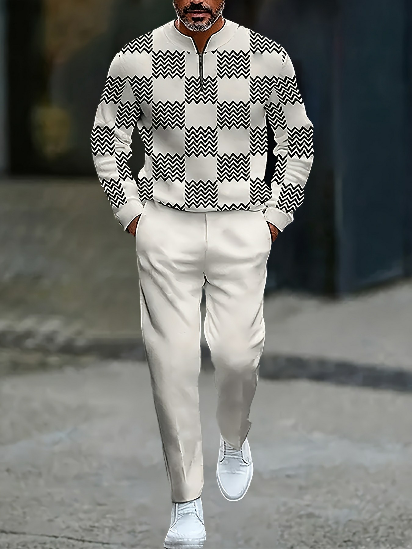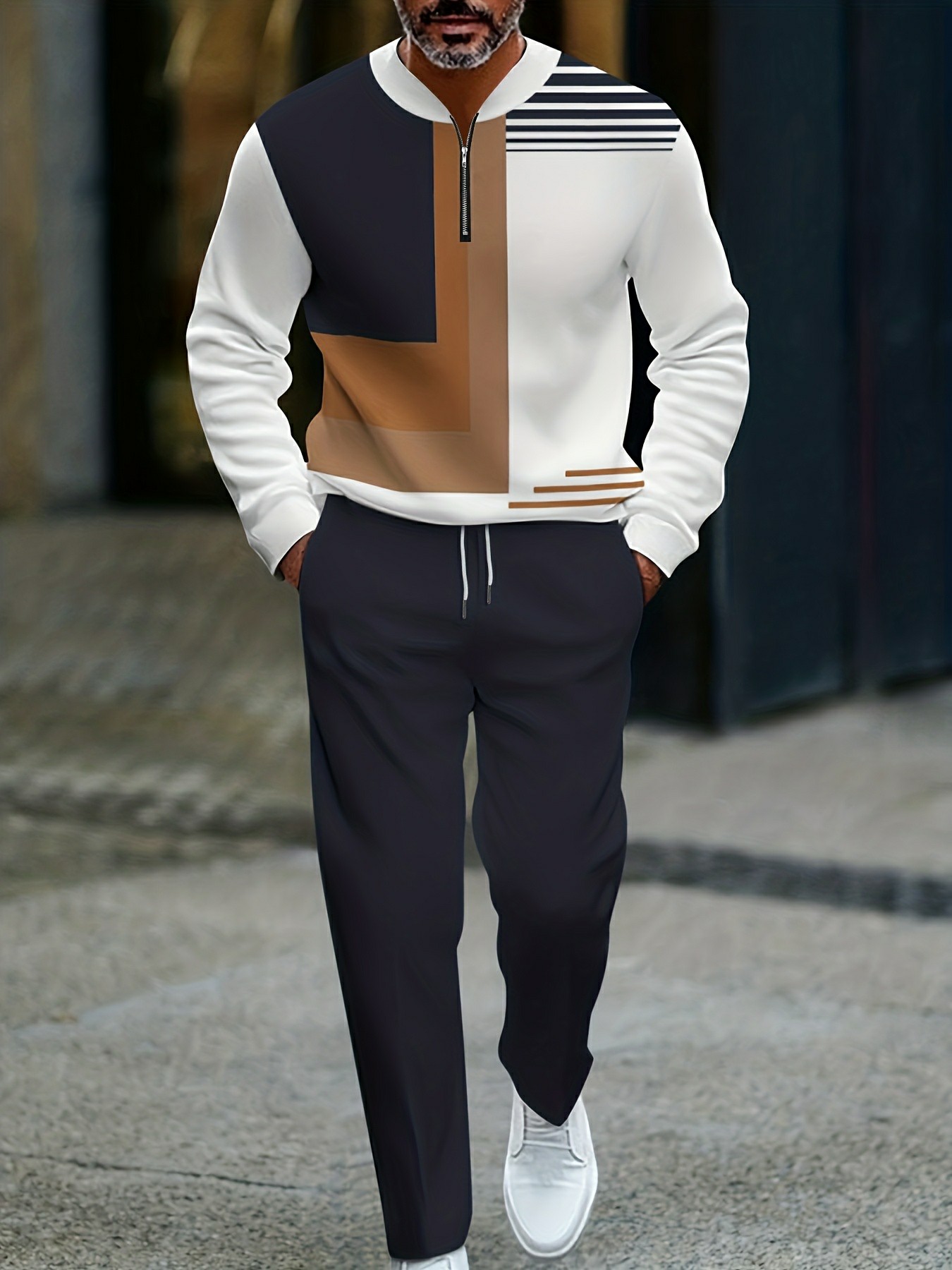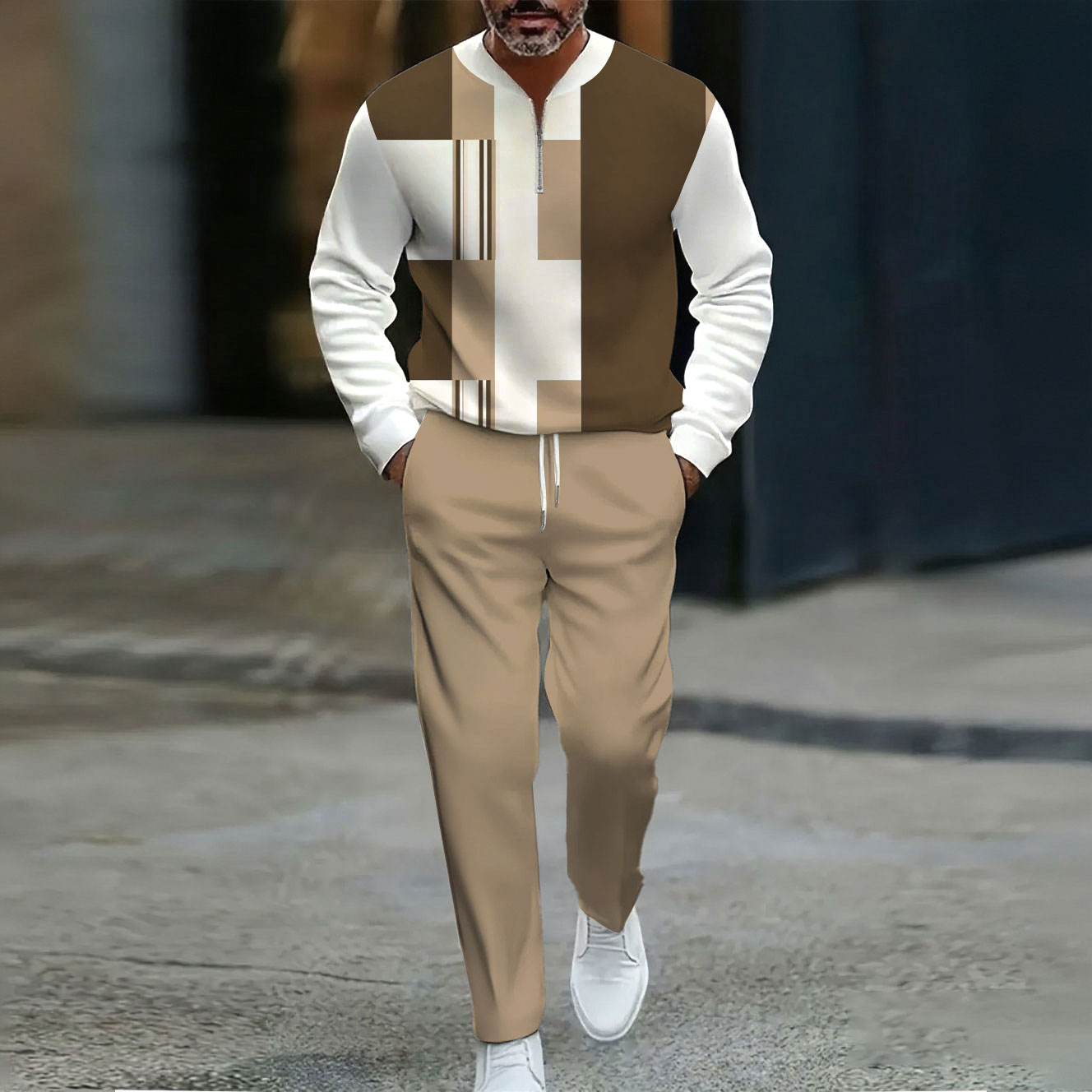 Men's Casual Khaki & White Color Matching Geometric Printed Round-Neck Zipper Long Sleeved Trousers Two-Piece Set