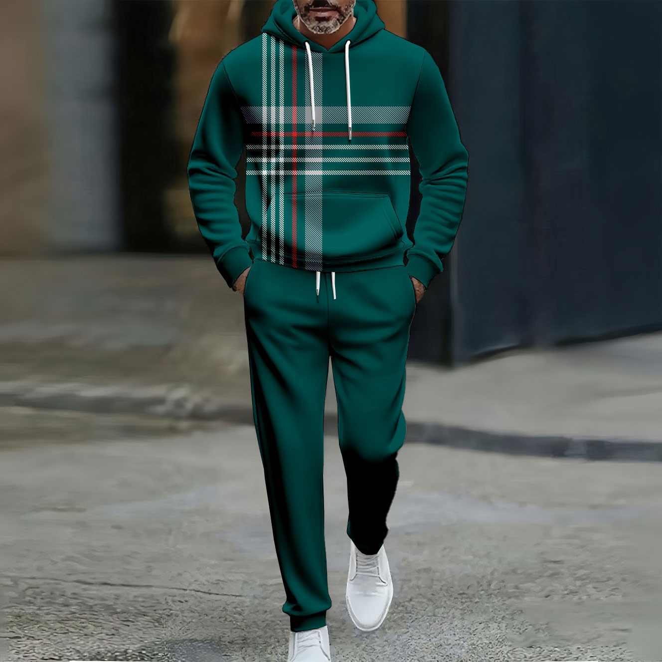 Men's Casual Color Matching Checked Printed Hooded Long Sleeved Trousers Dark Green Two-Piece Set