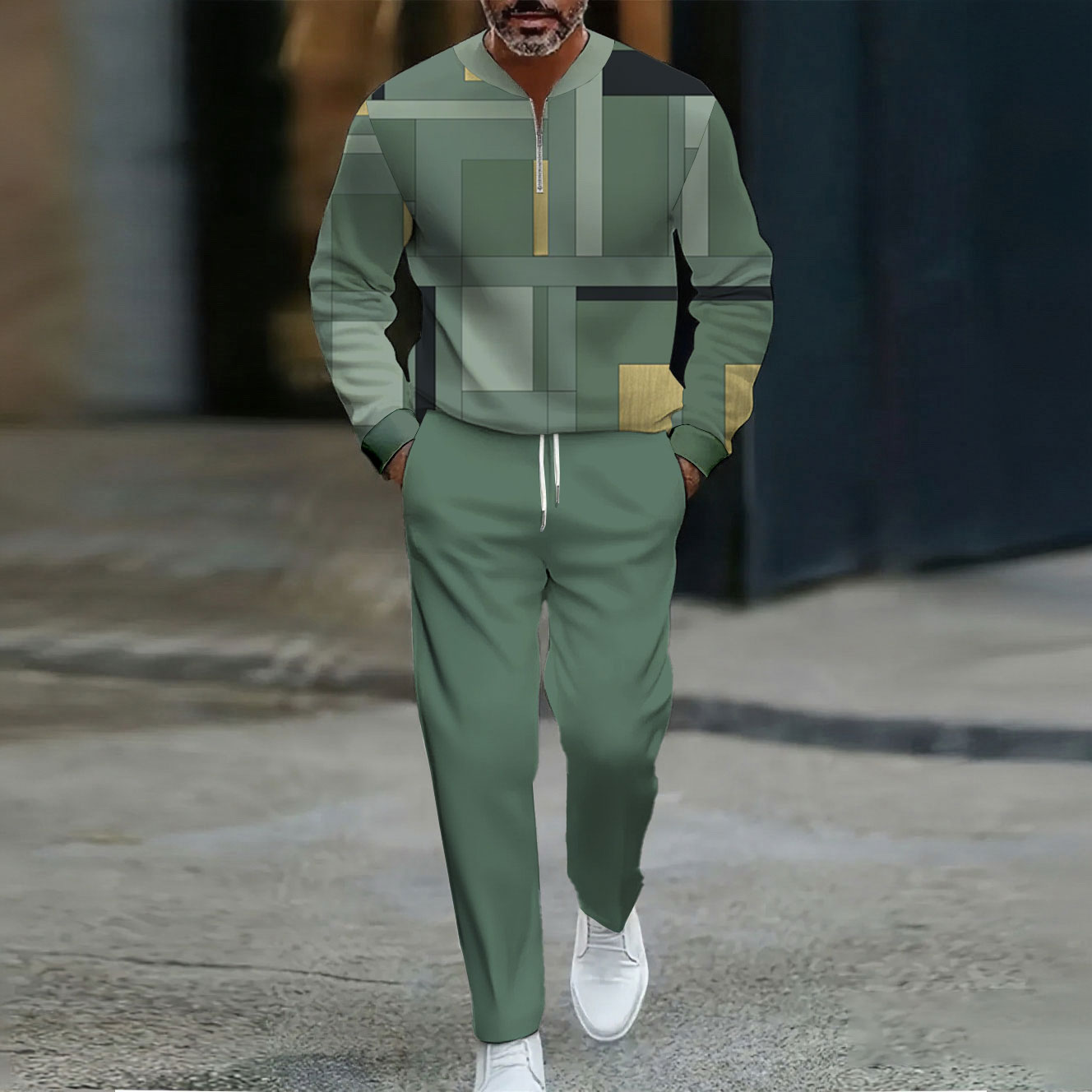 Men's Casual Green Color Matching Geometric Printed Round-Neck Zipper Long Sleeved Trousers Two-Piece Set