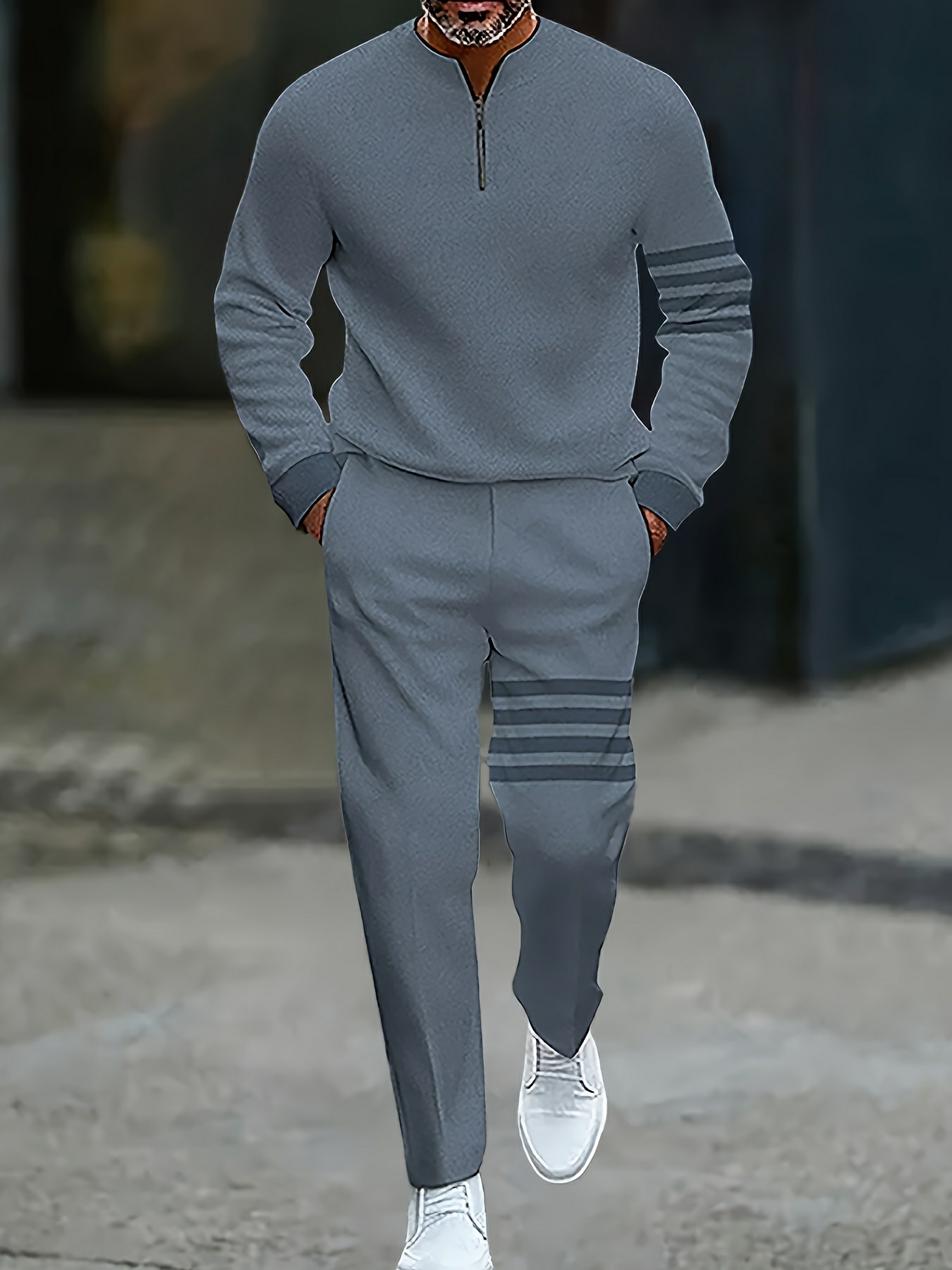 Men's Casual Gray & White Color Matching Striped Printed Round-Neck Zipper Long Sleeved Trousers Two-Piece Set