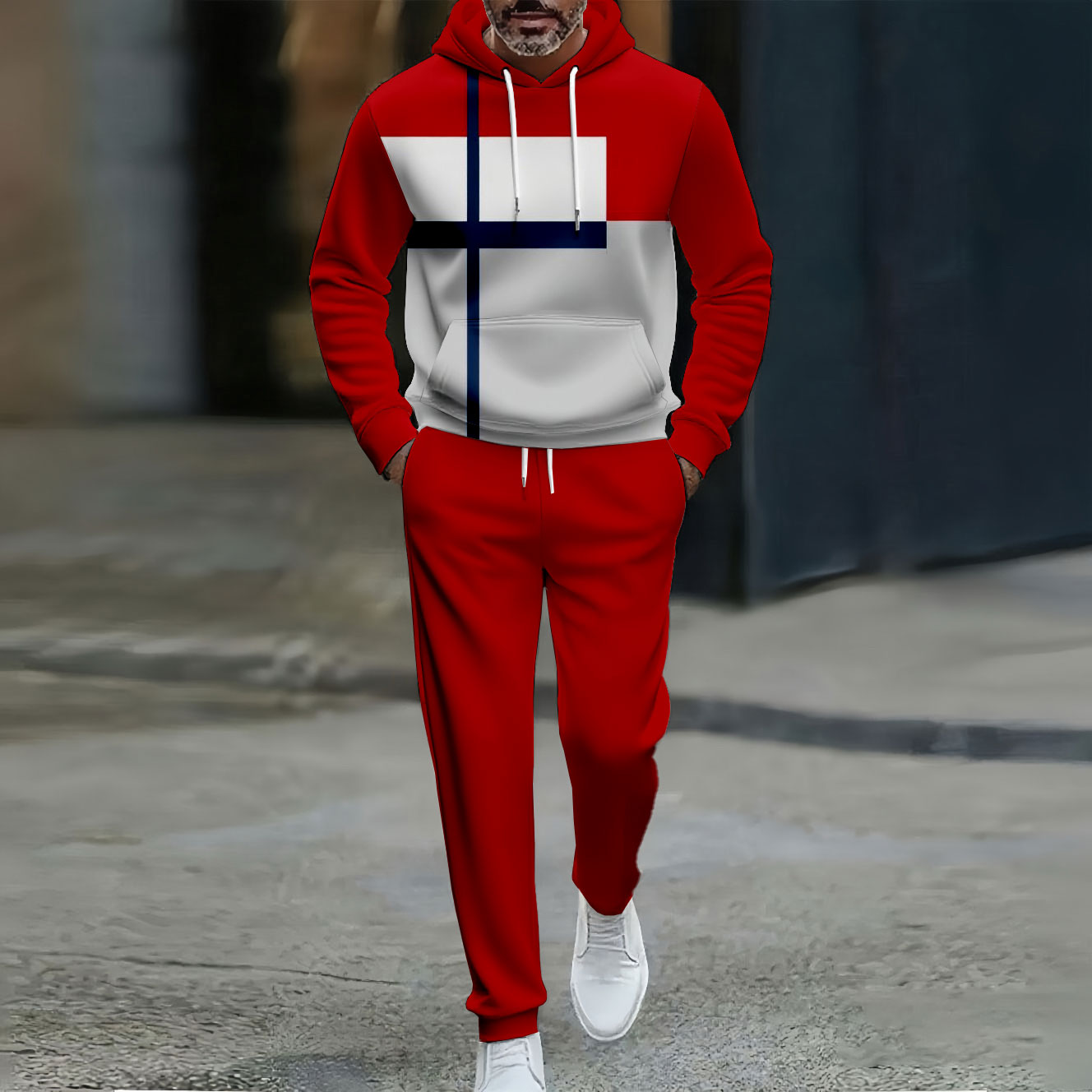 Men's Casual Color Red & White Matching Geometric Printed Hooded Long Sleeved Trousers Two-Piece Set