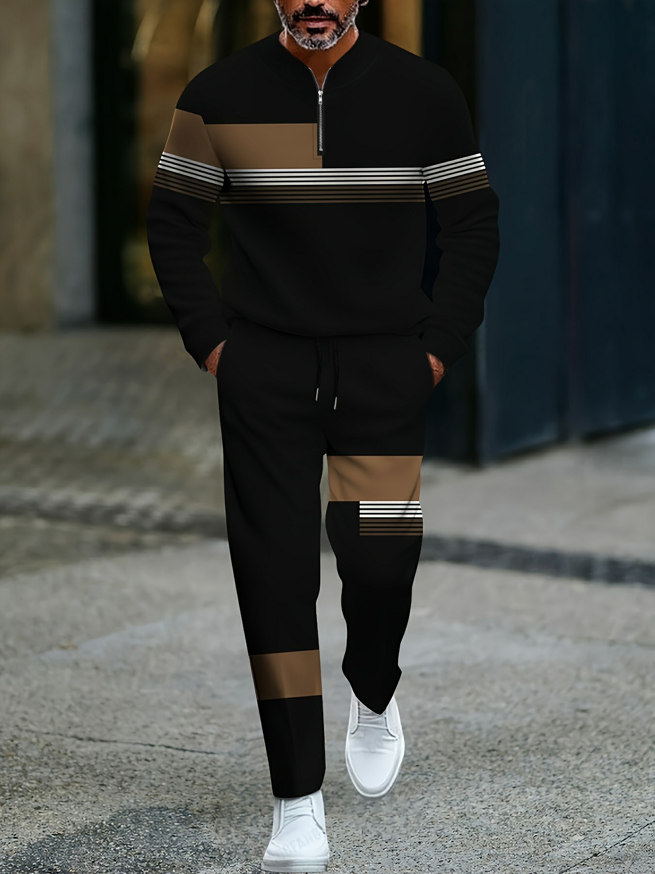 Men's Casual Black & Coffee Color Matching Striped Printed Round-Neck Zipper Long Sleeved Trousers Two-Piece Set
