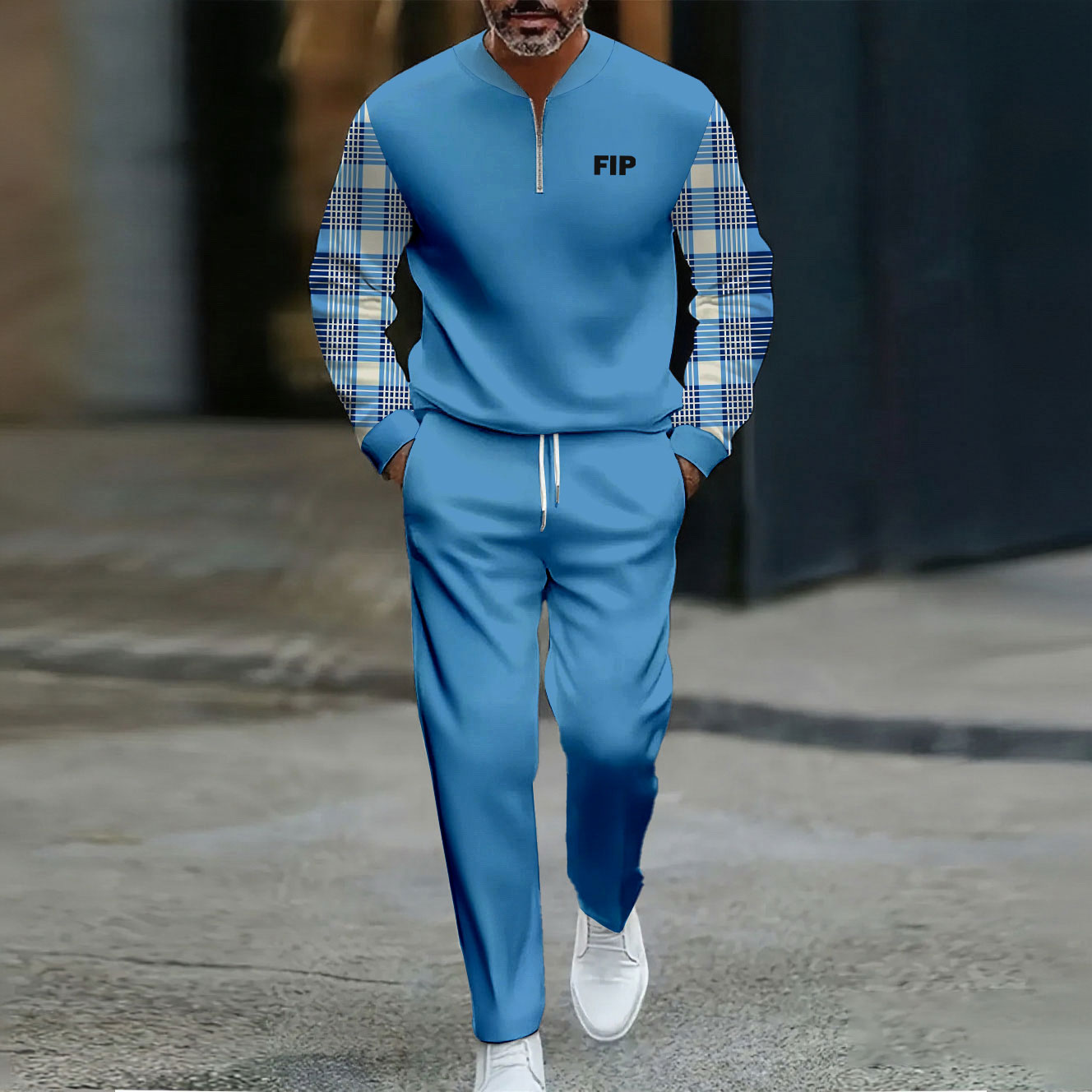Men's Casual Blue Color Matching Checked Printed Round-Neck Zipper Long Sleeved Trousers Two-Piece Set