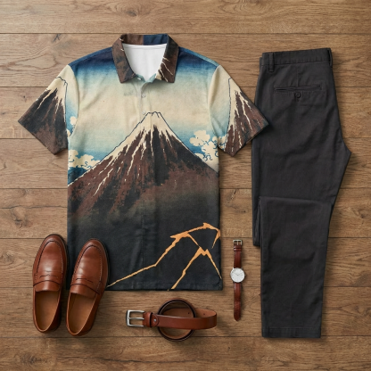 Men's Casual Brown Scenery Printed Short-Sleeve Polo Shirt And Trousers Two-Piece Set