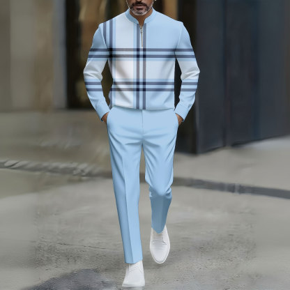 Men's Casual Bule Color Matching Checked Printed Round-Neck Zipper Long Sleeved Trousers Two-Piece Set