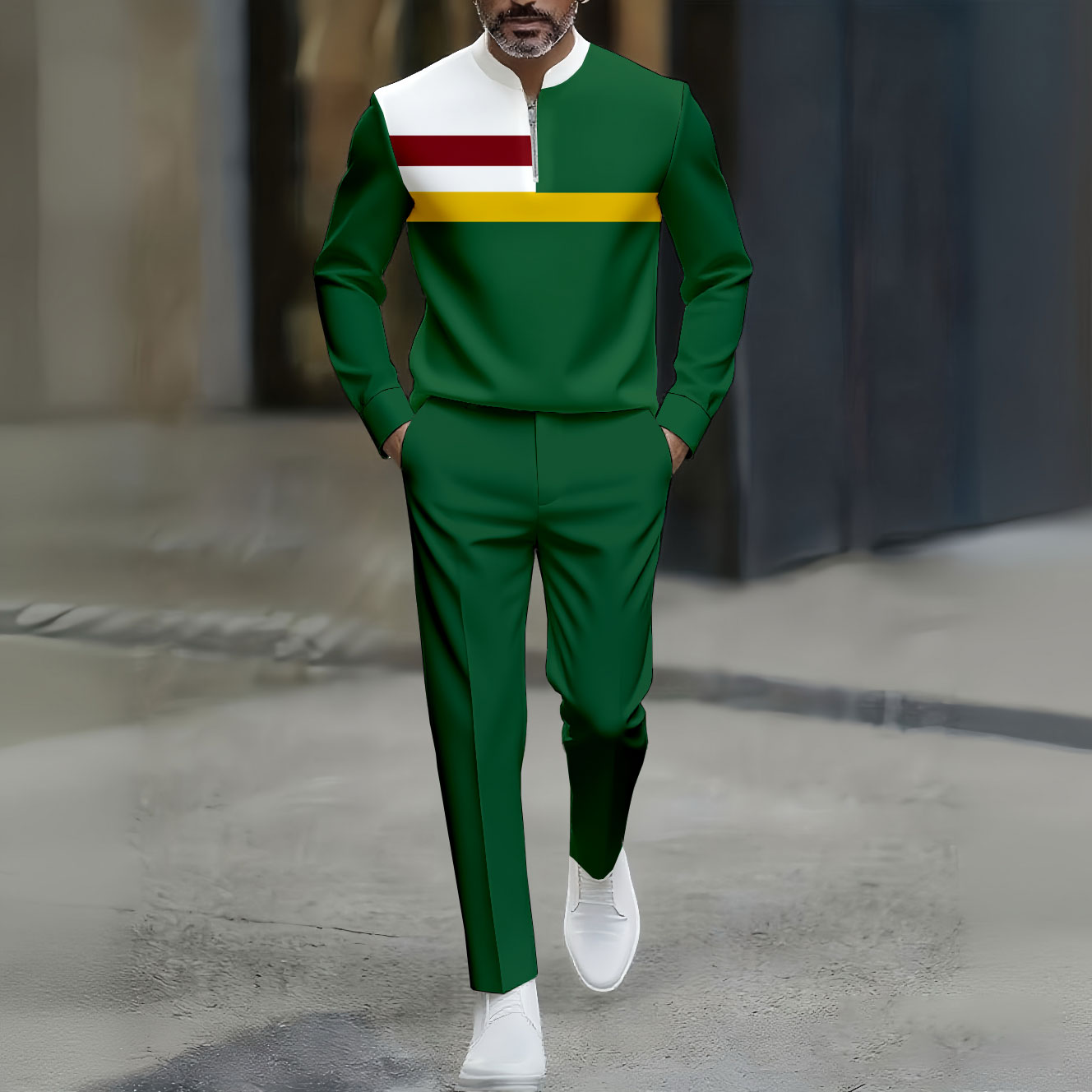 Men's Casual Color-Blocked Print Polo Collar Zipper Long Sleeve And Pants Two-Piece Set
