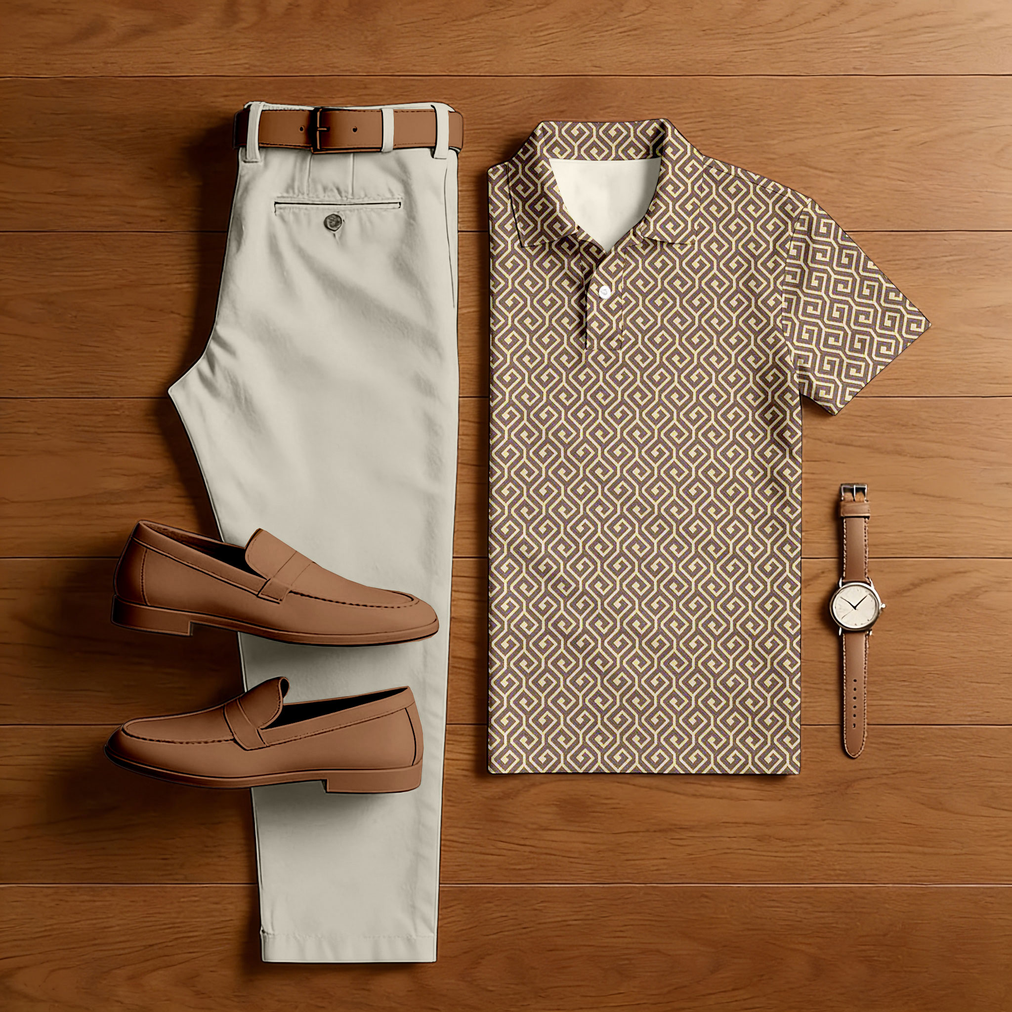 Men's Casual Coffee & Beige Color Matching Retro Printed Short Sleeved Polo Shirt & Trousers Two-Piece Set